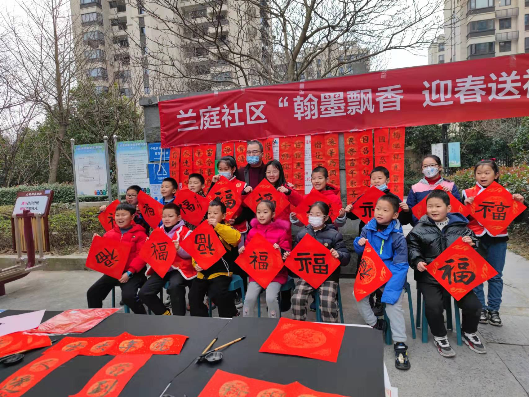 春节来临之际,为喜迎新春佳节,增加新年喜庆氛围,兰庭社区在立方寓中庭开展了“翰墨飘香,迎春送福”为主题的活动。活动组织青少年学生,在书法老师马老师指导下,书写新春福字与对联。完成的作品由小朋友和社区网格长,送给社区的老人和居民家中。小朋友和家长们纷纷表示,本次活动增加了过年的气氛,延续了中华传统文化,在老师的指导下,书法技能有了一定提高,而送出的对联和福字也受到了居民的欢迎,大家都感受到了浓浓的年味和祝福。