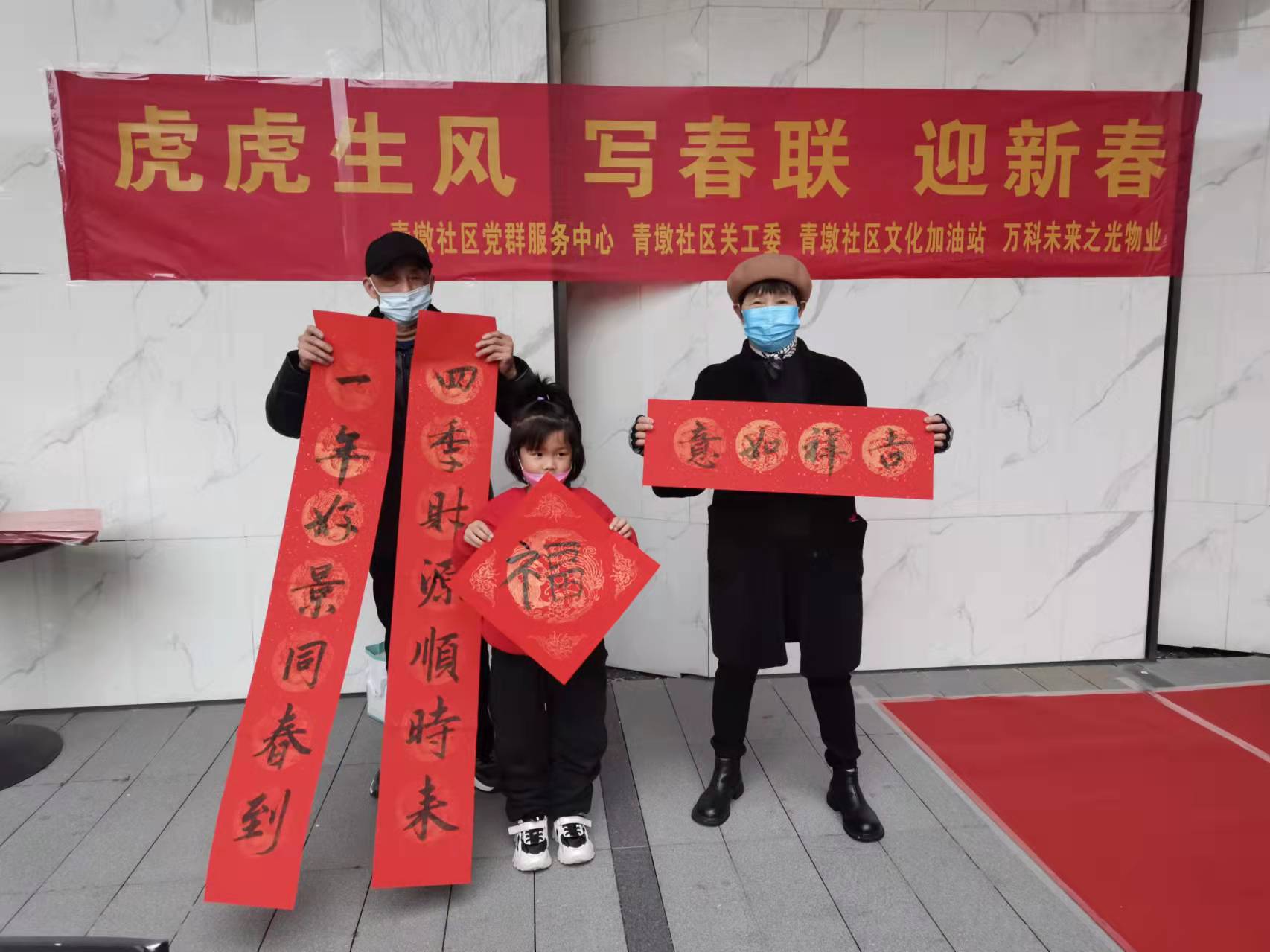为了丰富辖区居民的业余生活,喜迎虎年新春,青墩社区党群服务中心联合文化加油站和万科未来之光物业开展“虎虎生风 迎新年 写春联”活动,并邀请五老志愿者和居民小朋友参与活动。