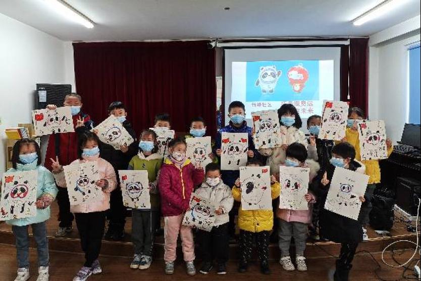 课前,黄璐妮老师先带领孩子们认识五环,认识本届冬奥会的吉祥物“冰墩墩”和“雪容融”以及吉祥物背后的含义。老师先在白纸上用黑笔勾勒出冰墩墩的轮廓,小朋友们跟着老师神情专注地开始画起来,老师不时停下手中的笔指导小朋友们一番。经过半小时栩栩如生的“冰墩墩”就出现在大家纸上。“我画的冰墩墩太可爱了,我想把它送给奥运健儿,为他们加油。”年纪最小的曹煊小朋友说。
