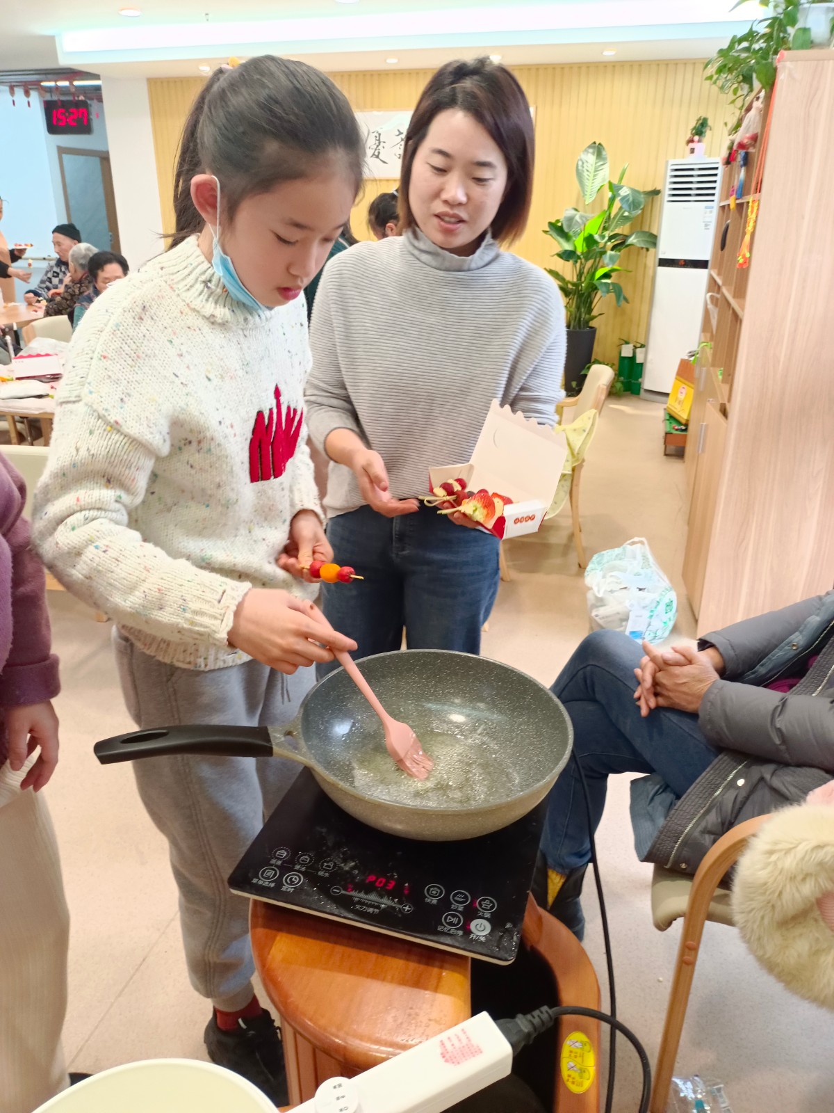 活动中,志愿者老师讲解了冰糖葫芦的历史及制作工序,让大家充分了解冰糖葫芦的由来。网格长将洗好的小金桔、山楂、草莓、香蕉和竹签分发给大家,还有冰糖、电磁炉摆放在两张桌上。随后,大家在老师的指导下,开始动手制作自己的“冰糖葫芦”。大家将甜甜的金桔、可口的山楂、营养丰富的草莓进行组合、搭配,制作成串,再放到锅中刚刚熬好的糖浆中,裹上一层晶莹透亮的糖衣,再穿上一层薄薄的糯米纸,一串串甜美可口的冰糖葫芦就新鲜出炉了,煞是诱人!