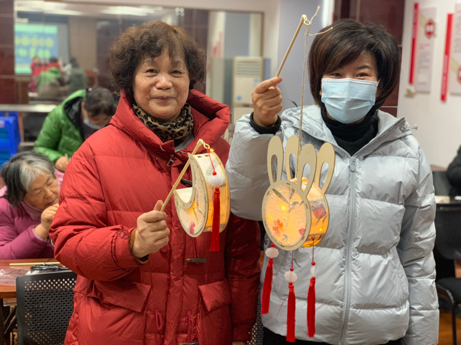 活动现场,老师初步讲解花灯制作方法,然后由大家自主操作,老师从旁针对性指导。不多时,各种花样的灯笼在阿姨们的巧手下诞生,不仅有传统的月亮、兔子样式,也有应景的小老虎,还有可爱的冰墩墩助力。现场的居民手持花灯,摆出各种姿势展示手中的灯笼,喜悦之情溢于言表。