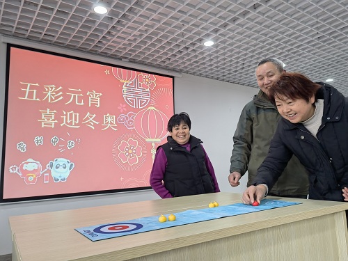 “冬奥会每四年举办一次。”“这一届冬奥会的吉祥物是冰墩墩和雪融容”。问题刚提出就被现场小朋友们秒答。在活动场地的另一边,几个居民围着桌子正在比拼桌面冰壶。一个老年队,一个儿童队,一边各拿一种颜色的冰壶,展开了一场老少间的“激情碰撞”。“正中红心,大获全胜!”“哎呀,差一点就可以到圆心了”。有赢了比赛的得意,也有失去得分的遗憾。比赛现场的氛围丝毫不输奥运赛场。
