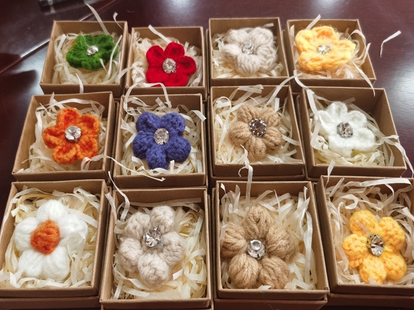 活动伊始,慧心坊的贺阿姨介绍了如何拿针、起线、简单的钩针针法等,并进行了现场演示。骨干们目不转睛地盯着贺阿姨灵活的双手,一根钩针,一团普通的毛线,不一会儿就形成了一朵美丽的小花。演示完小花的制作过程以后,贺阿姨就开始教骨干们编织。骨干们都迫不及待地拿起针勾起来,短针,长针,一步步按着老师的节奏学起来,遇到不会的还会跟身边的同伴交流。随着最后一个编针的结束,小花也就做好了,大家打上固定结,减去多余的毛线,用胶水粘上花心和金属配件,一个精致的泡芙花胸针就做好了。大家纷纷别在衣服上向周围的伙伴展示,每个人脸上都洋溢着成功的喜悦。