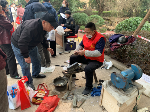 3月5日上午,天合社区长岛花园小区的中庭正是一番热闹景象,磨刀、理发、皮具护理、补鞋、小家电维修、口腔义诊、眼科义诊、量血压血糖等一系列志愿服务正在如火如荼地开展。