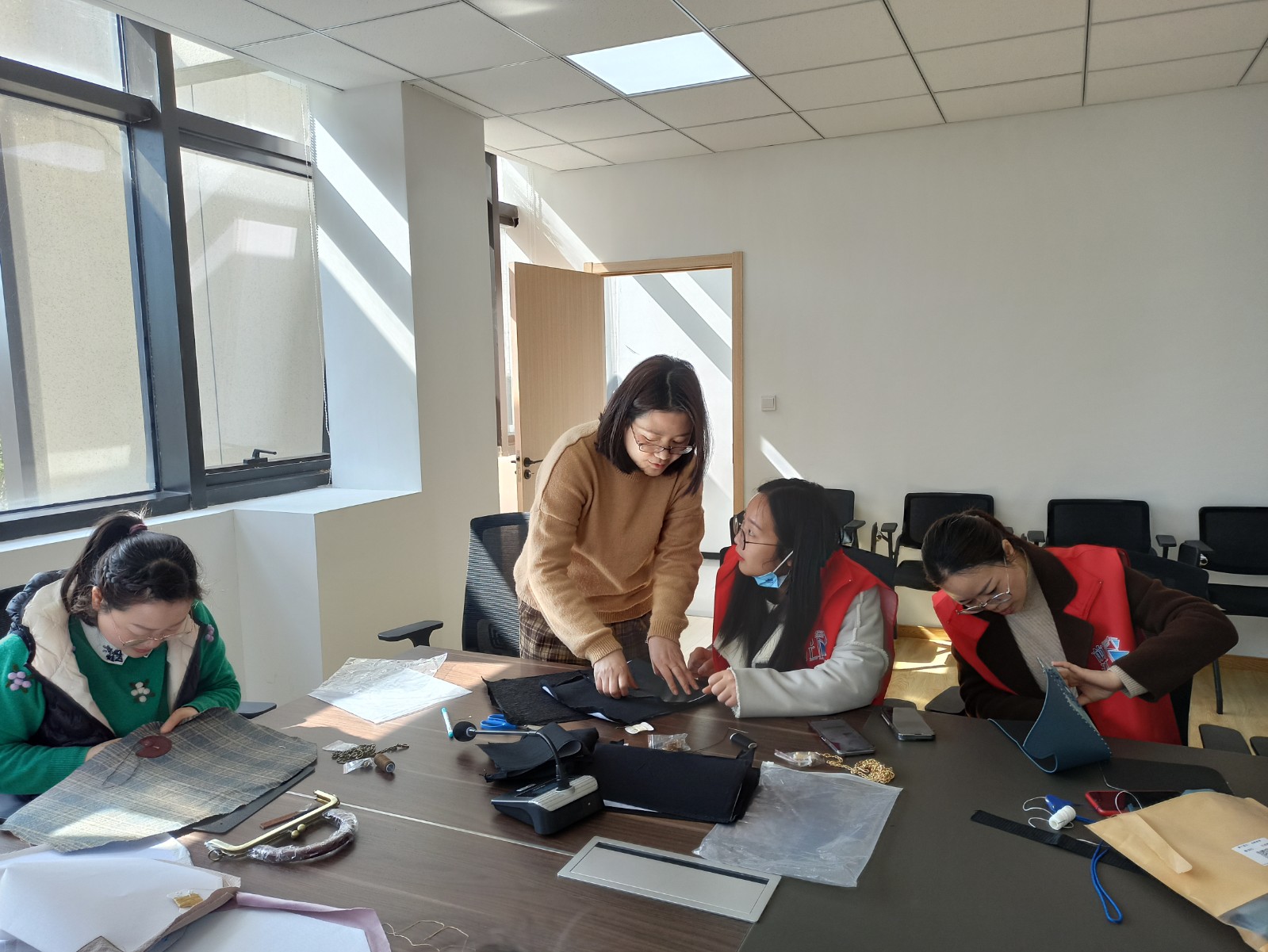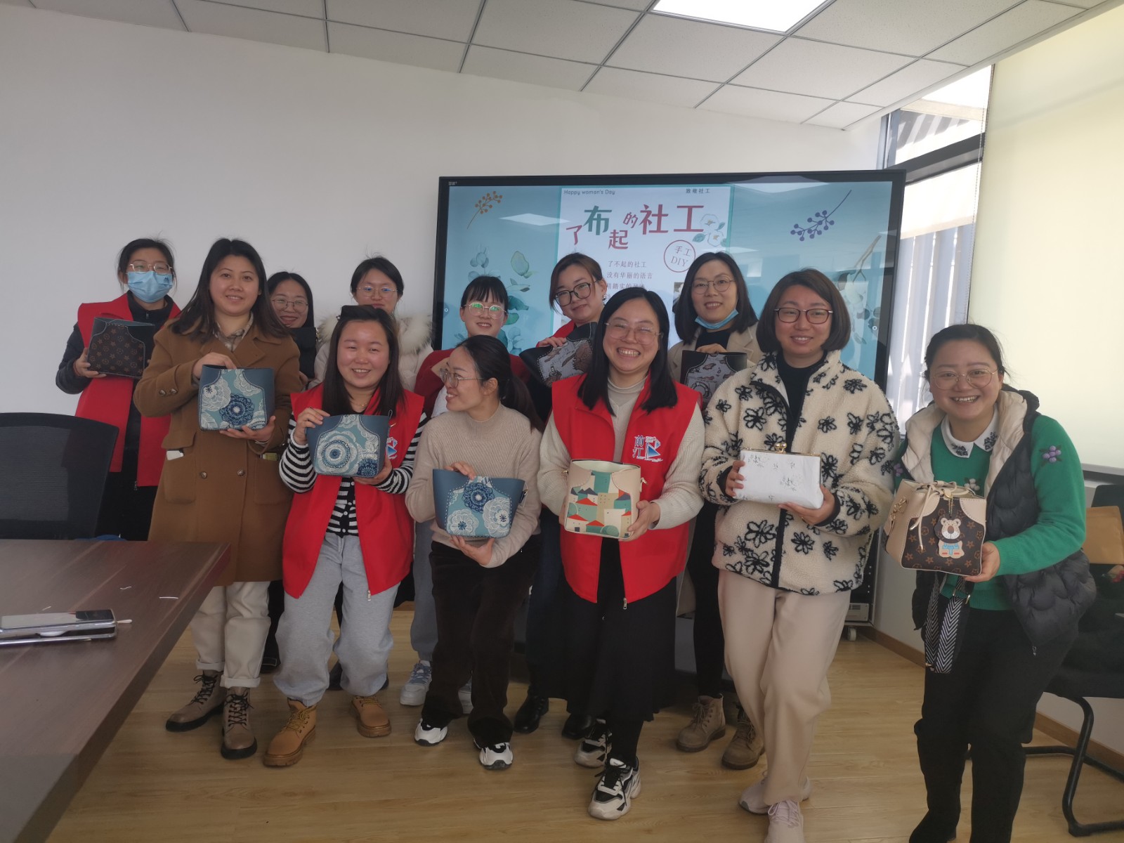 活动开始前,社区陈书记女同胞献上节日的祝福手工课堂开始,社区网格长为大家分发了手工材料包,在老师的指导下,有的人很快掌握了要领,先学会的在完成自己的作品之余,还热心地手把手帮助周围的人,现场气氛活跃,社工之间互相沟通、互相学习,一起交流编织的技巧。两个多小时的手工缝制活动,大家都完成了自己的手工布袋,看着自己缝制的成品,欣喜之情油然而生,大家纷纷拍照,在微信群和朋友圈分享自己的作品。