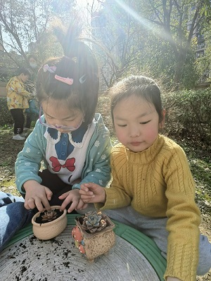 3月10日上午,天悦社区的志愿者们带着盆、土、多肉嫩芽来到了博悦幼儿园,邀请小小网格长们亲手种下一盆属于自己的绿植。活动开始前,志愿者们通过互动问答的形式向小小网格长们介绍了“植树节”的来历,讲述了环保种树的意义。接着,大家撸起袖子,拿着工具,开始了工作。玉露、生石花、鹿角海棠、吉娃娃、晚霞之舞等十多个品种牢牢抓住了大家的目光。翻土、修剪、移栽,小小网格长们虽然年纪小,但是干起活来却井井有条,呈现出一派热火朝天的劳动场面。看着自己亲手种好的植物,来自大二班的小朋友说:“我给这盆多肉起名叫小春,希望它能够茁壮成长,把我们的校园环境打扮得漂漂亮亮的。”另一个小网格长说:“我的盆栽叫‘阳阳’,它像太阳一样点亮我们的幼儿园,点亮我们的大家庭”。在活动的最后,社区还聘请了10位小网格长,担任网格内的环保宣传大使,鼓励更多的人加入到社区的环保队伍中来。