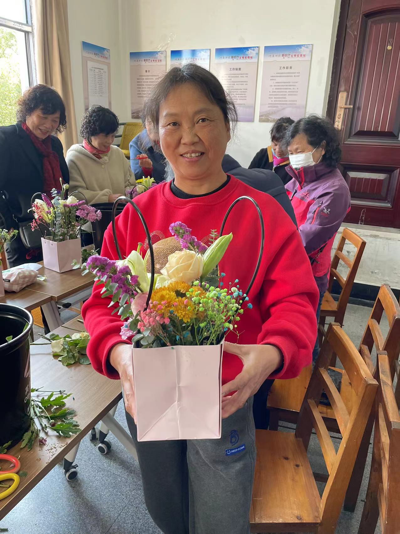 阿姨们一边利落地修剪鲜花上的枝条,一边用心地摆弄,嘴里还念叨着插花技巧“宾主要分清,大花适当佩小花、深浅搭配要合适、上疏下密、错落有致。”不到一会儿功夫,一盆盆美丽鲜艳艺术感极强的花艺作品已经跃然眼前。志愿者阿姨们以前都没学过插花,学习了一会儿就能呈现美丽的作品,真的是心灵手巧。做完花艺,大家情绪都很高涨,便摆着花跳起了舞步,唱起了歌,鲜花配着阿姨们真挚的笑容,真是最美丽的画面。