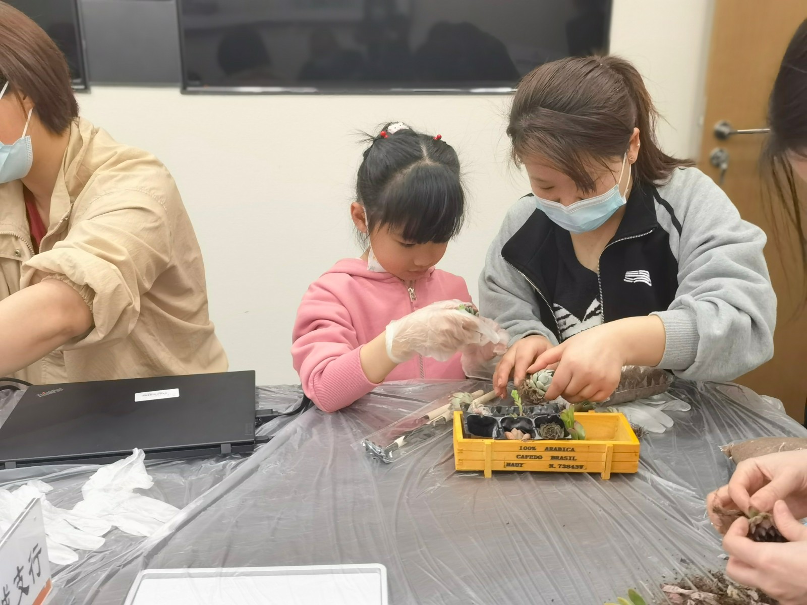 活动现场,首先工作人员介绍植树节的来历和节日意义,让小朋友们对植树节有一个初步的认识。接着,工作人员像大家展示了不同种类的多肉植物,并讲授多肉植物的日常养护,如何浇水、施肥等。最后,小朋友们按着工作人员讲解的方法,把自己的多肉小心翼翼的种进花盆里。