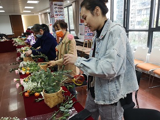 活动中,花艺老师给大家讲授选花、裁剪、颜色搭配、造型等方面的插花技巧。一支支鲜花铺在桌面上,大家在老师的指点下,结合手中分到的花材特点和审美情趣,进行尝试和实践,不时和老师探讨,用心制作花艺作品。经过将近1个小时的制作,一篮篮创意十足,鲜艳美丽的插花作品呈现在大家眼前。大家非常开心,纷纷和自己的作品合影。
