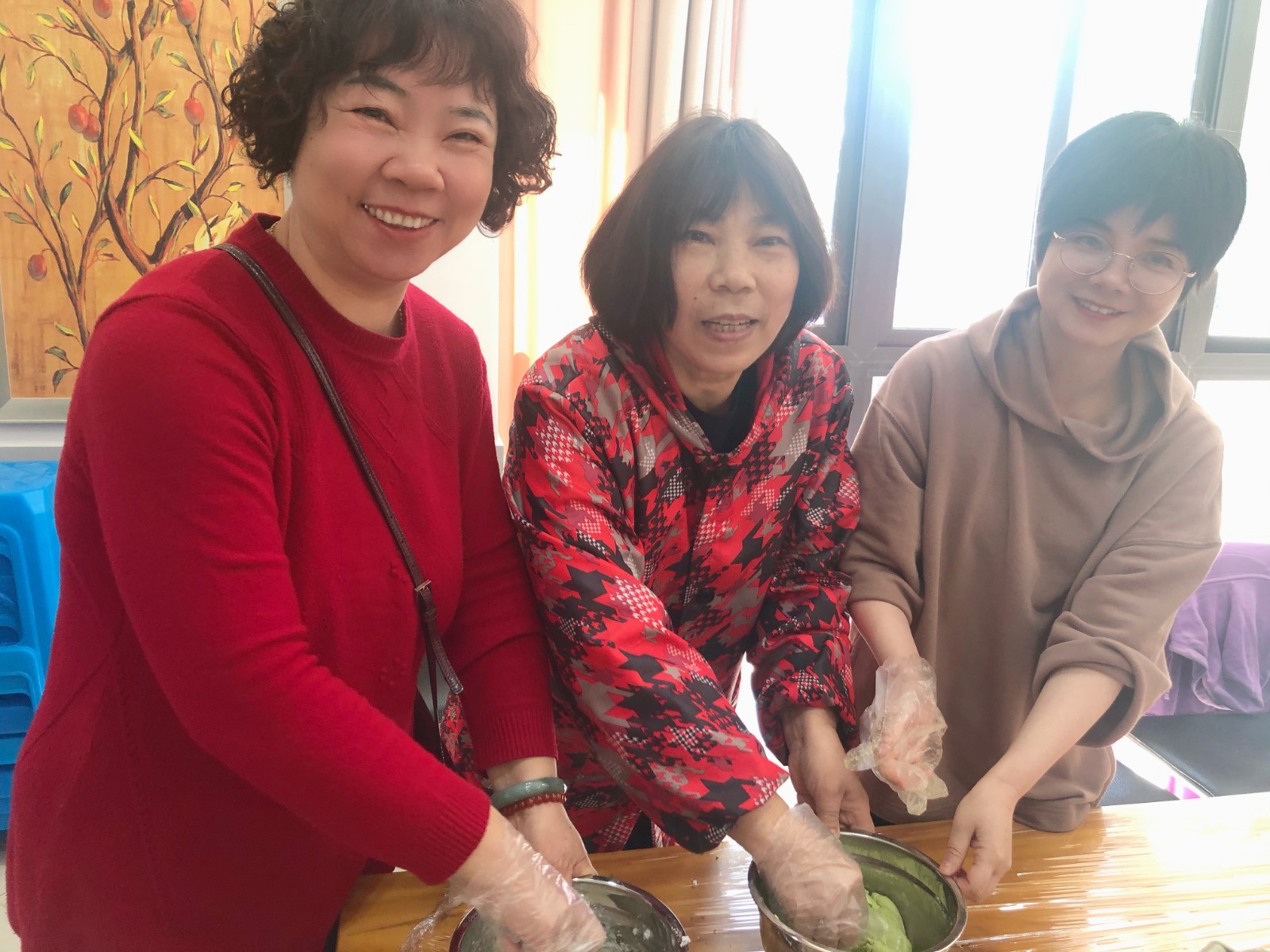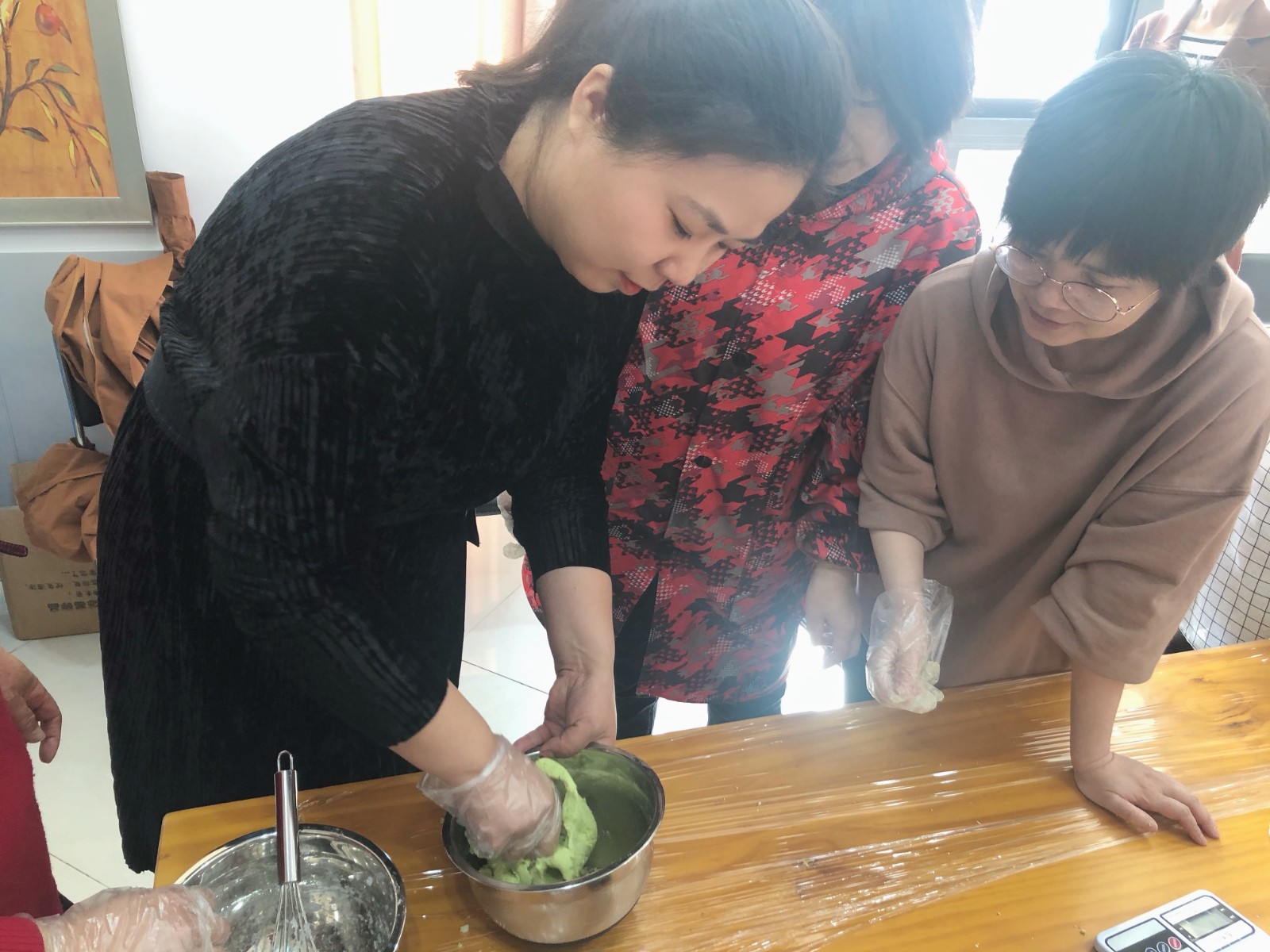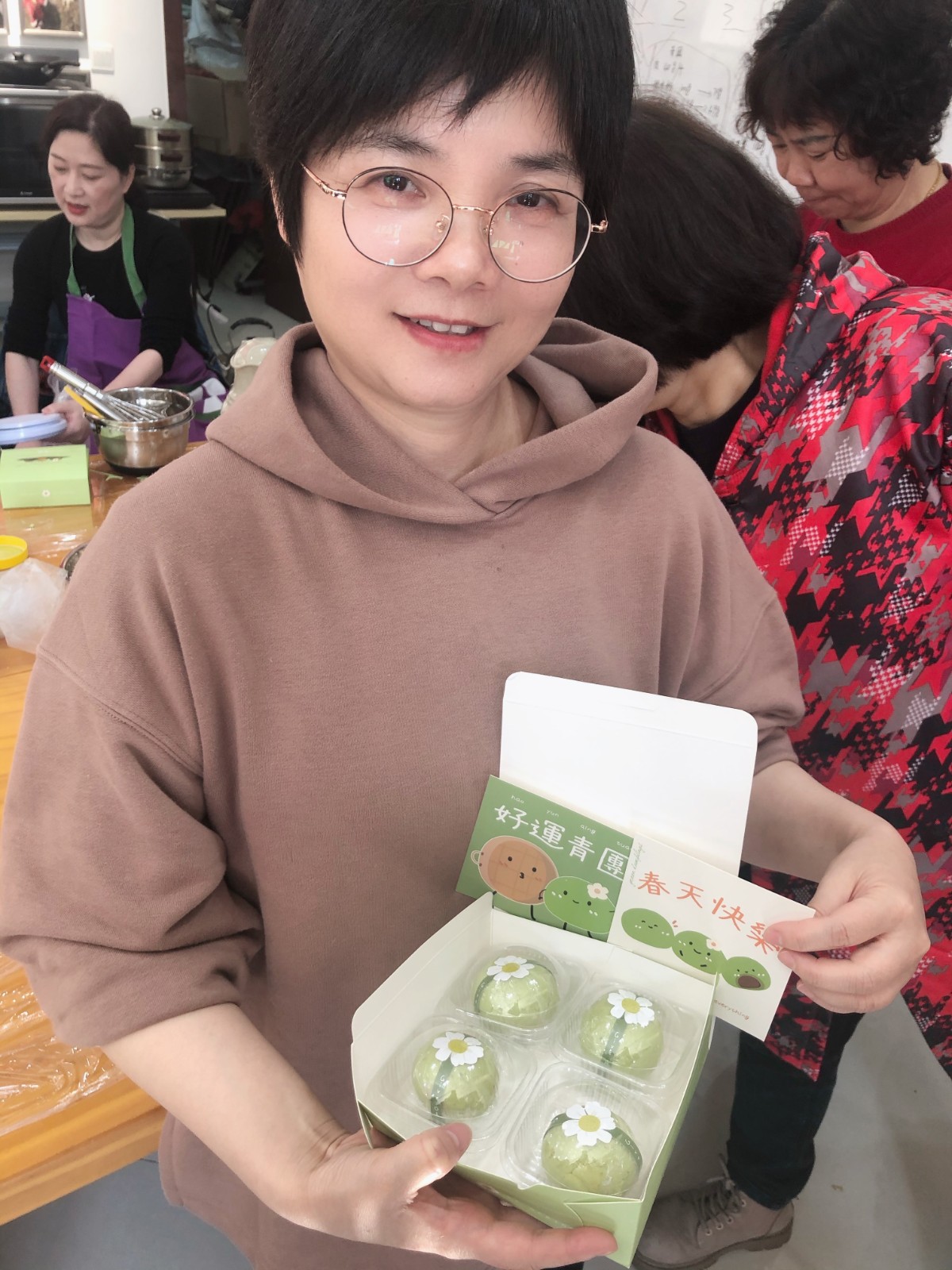当下正值阳春三月,目之所及一片生机勃勃的绿,烘焙班的主题切换成了应景的青团。一众材料准备齐全后庄老师开始了制作讲解,材料的配比,操作的步骤以及注意事项,每一个阿姨此时就像年少时听课的学生一般认真做着笔记,看着老师的制作演示。实操开始,迅速几人成组,遇到困难向老师请教,很快就出了成果。    “哇,太好看啦,我们怎么这么厉害啊,哈哈哈哈。”随着阿姨爽朗的笑声看到了那个可爱的小青团,青草绿的小团子点缀着一朵小雏菊,春的气息扑面而来,这个退休的阿姨此时获得了满满的成就感。部分打包装盒,部分现场蒸熟品尝,现场的氛围十分热烈,作为一个社区工作者深刻的感受到了这群老年阿姨的热情以及从中获得的快乐。身为一个为居民服务的人员,看着一张张露出的笑脸成就感满满,看着阿姨们手上的这一抹春绿,这就是我们社区工作者工作的意义吧。