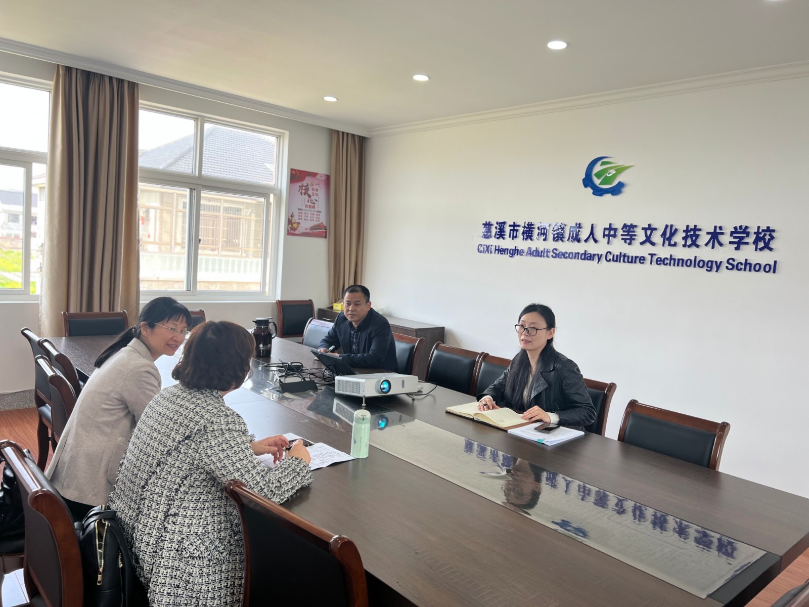 329日下午,慈溪市教育局职成教教研室黄百央副主任、张建波教研员来横河成校调研,阮迪女校长参与接待,孙百权、赵赟群等老师全程参与交流研讨。