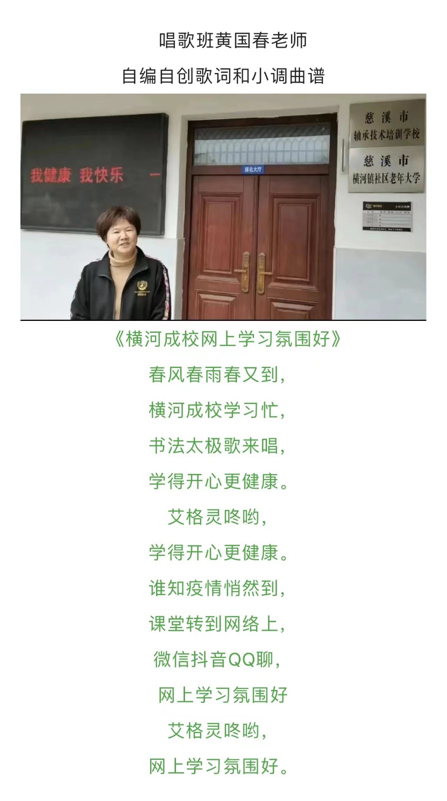 横河镇社区老年大学线上教学精彩纷呈,唱歌班、戏曲班、书法班、太极班网上学员达到268人次。学员们纷纷在家里书写起来. 完成了一幅幅线上课堂的书法作品,拍摄上传。拍好示范视屏,学员们都在微信群里,学唱分享,群里非常热闹,有的学员用马灯调学唱、有的学员用杨柳青调学唱,效果非常好。