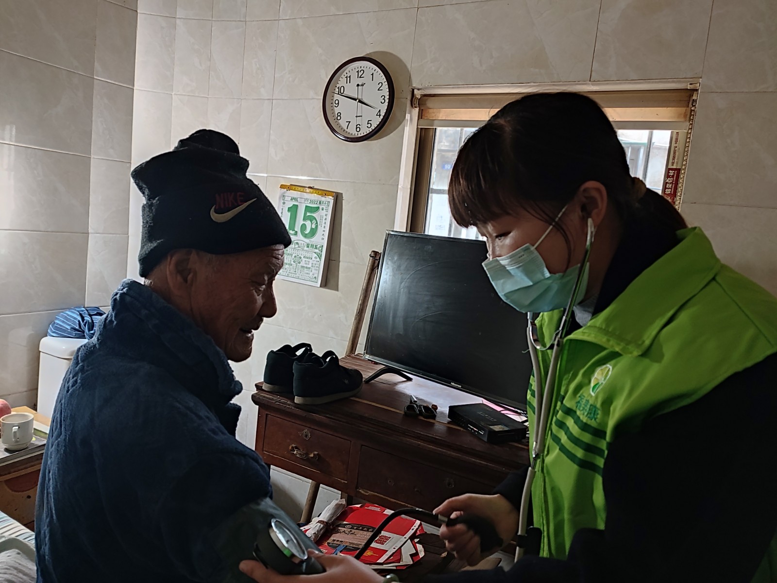 老人家中,福寿康医护人员细心地为老人测量血压,详细询问其身体、生活状况,并叮嘱老人平时饮食少盐清淡,适量运动,保持良好乐观的心态。社区工作人员还询问了老人的日常生活需求,亲切地与老人进行交谈,告诉老人有困难随时联系社区。