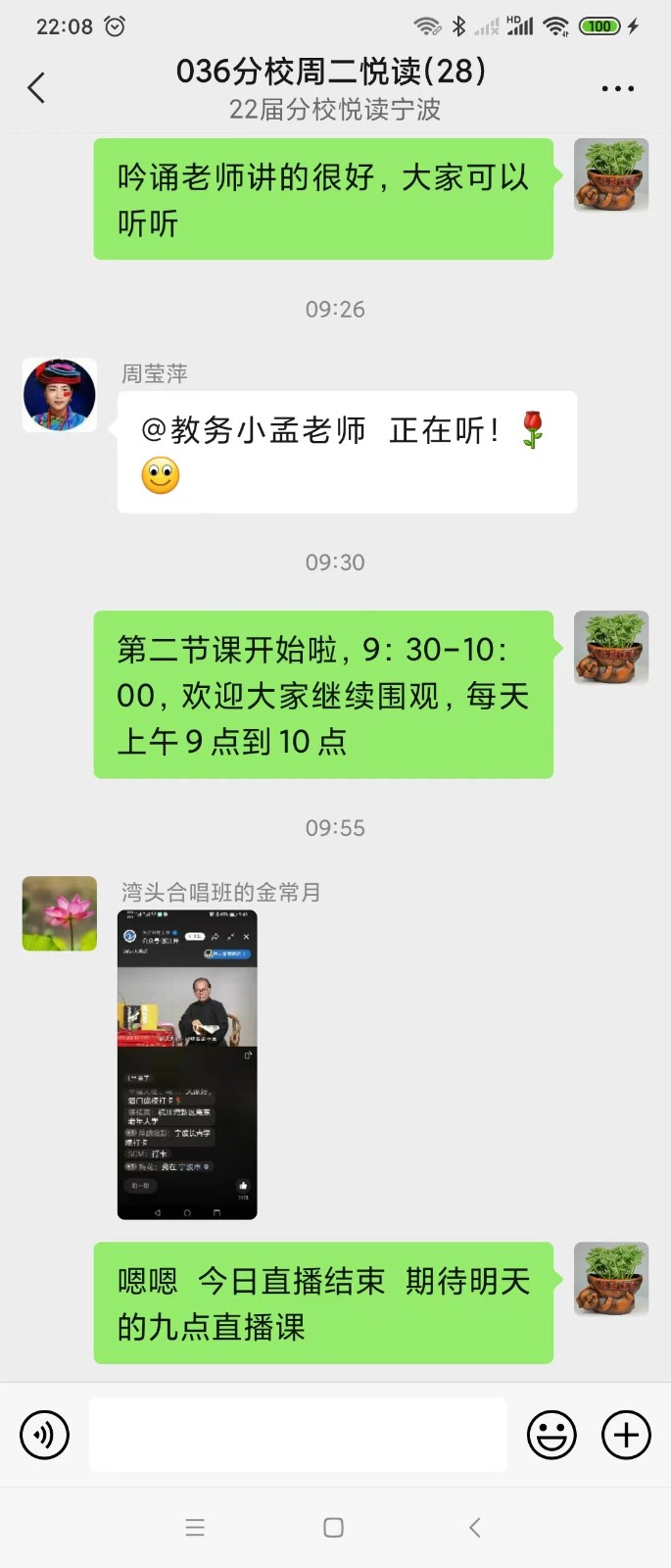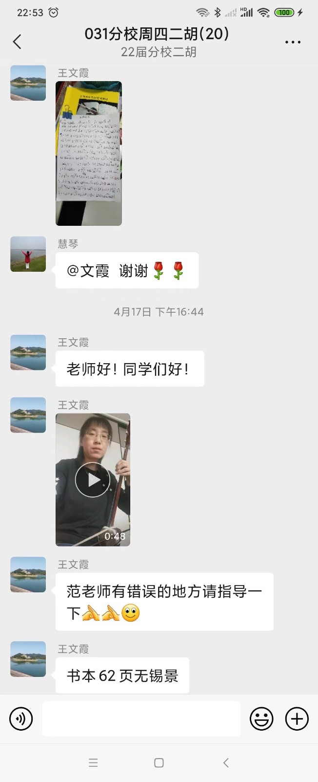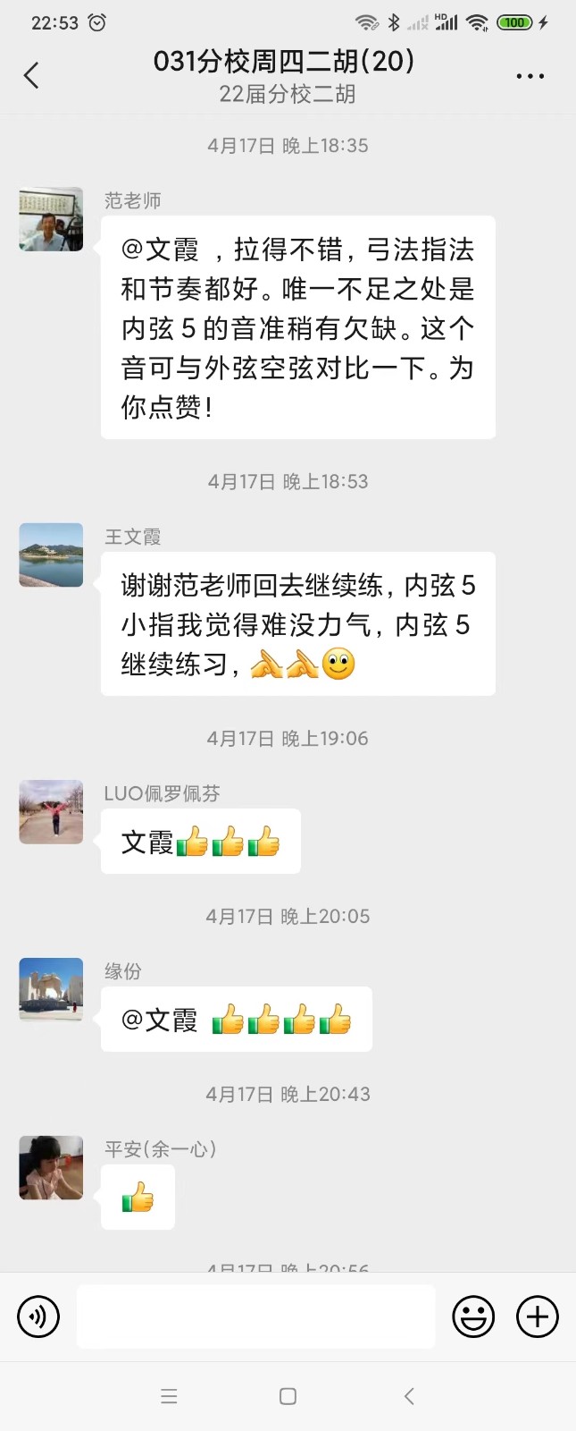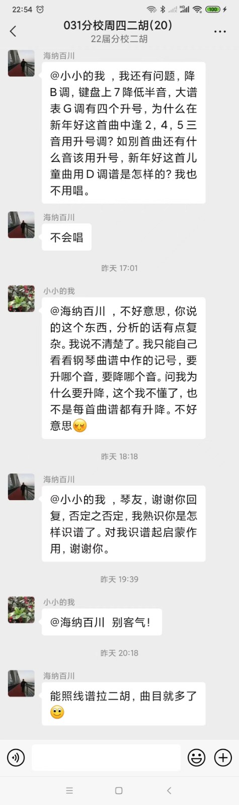 我们二胡班的王班长不但在班级群里积极互动,鼓励大家疫情期间在家练习,还鼓励大家把不懂的问题说出来互助互学。群内的范老师和群内热心的同学都积极解答问题,帮助大家解决在家练习时候遇到的困惑。最近,王班长还在群里给大家送上了自己录制的葫芦丝曲《疫情过后》,期待疫情过去,早日复课,可以和同学们一起看山看水看花,早日回到一起学乐器的快乐日子……