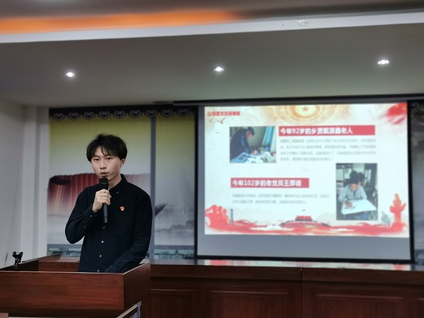 郑琦艇围绕共同富裕主题,以“幸福”为关键字,同时结合社区青年党员“我为老者办一事”红色志愿活动解读了新时代共同富裕的奋斗目标下,老年人精神富足在共同富裕中的重要作用,同时分享了社区青年党员在提升老年人精神世界富足所做出的共享,鼓励青年党员要不忘初心,牢记使命,积极投身中助老活动,为实现共同富裕奉献自己的一份力量。作为今年刚转为正式党员的贺璐霄,通过介绍电影《我和我的祖国》之《护航》的剧情,解读电影带来的启示和导向,着重强调了祖国的繁荣昌盛中护航人倾情付出的重要性,呼吁青年党员要不断夯实自己技能,加强思想修养,培养艰苦奋斗的精神,积极做好新时代的护航人。