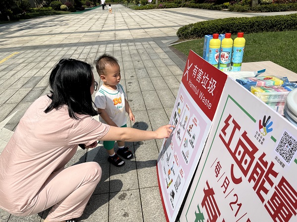 “有害垃圾别乱扔,可以拿过来兑换。”志愿者积极的向居民“喊话”,还利用宣传板上的例子,结合生活中遇到的实际物品生动详细的给前来咨询的居民讲解有害垃圾的种类以及投放要求。“哇,原来这些都是有害垃圾呀”住在美宸园小区的颜阿姨指着宣传板上的例子说,“家里有好几张X光胶片,还有一些过期药品,我赶紧去拿来。”还有带着孩子下楼来玩的宝妈,指着我们宣传板上的图片给小朋友讲垃圾分类。