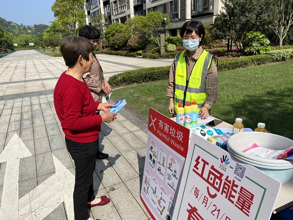4月21日,清泰社区在美宸园小区开展“红色能量 有害换有爱”有害垃圾兑换活动。活动现场吸引了不少居民前来参与,有的咨询兑换规则,有的询问有害垃圾的种类,有的咨询活动的时间,有的则直接拎着有害垃圾过来兑换……“刚搬来这边,很多有害垃圾都扔了,只剩这么2颗纽扣电池了,拿来参与下活动。”有位家住美宸园的阿姨积极参加兑换活动。