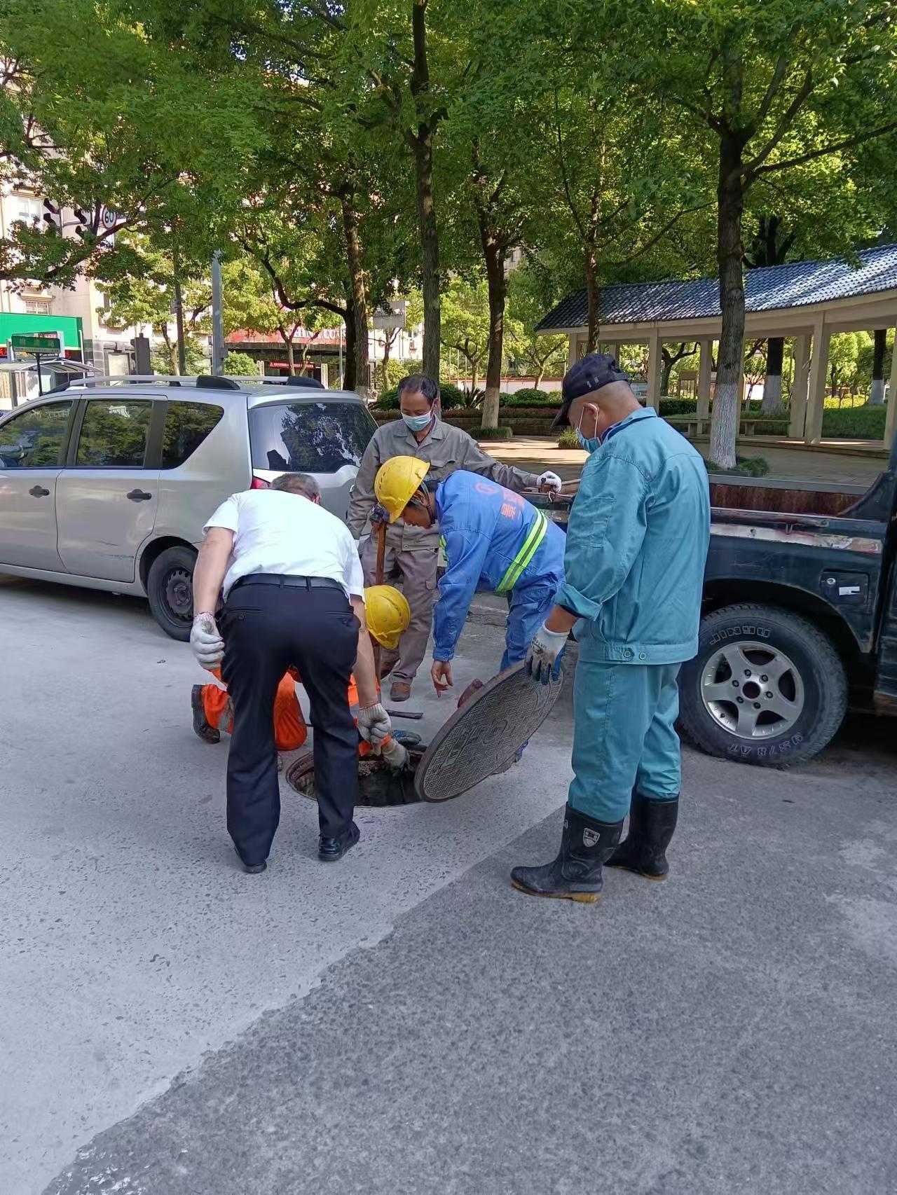 盐仓社区在辖区内巡查中发现槐树路38弄无物业小区下水道堵塞,并出现污水外溢现象,社区干部闻讯后积极协调疏通下水管道,为居民解忧。
