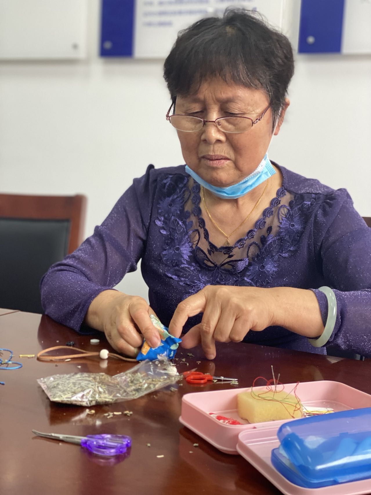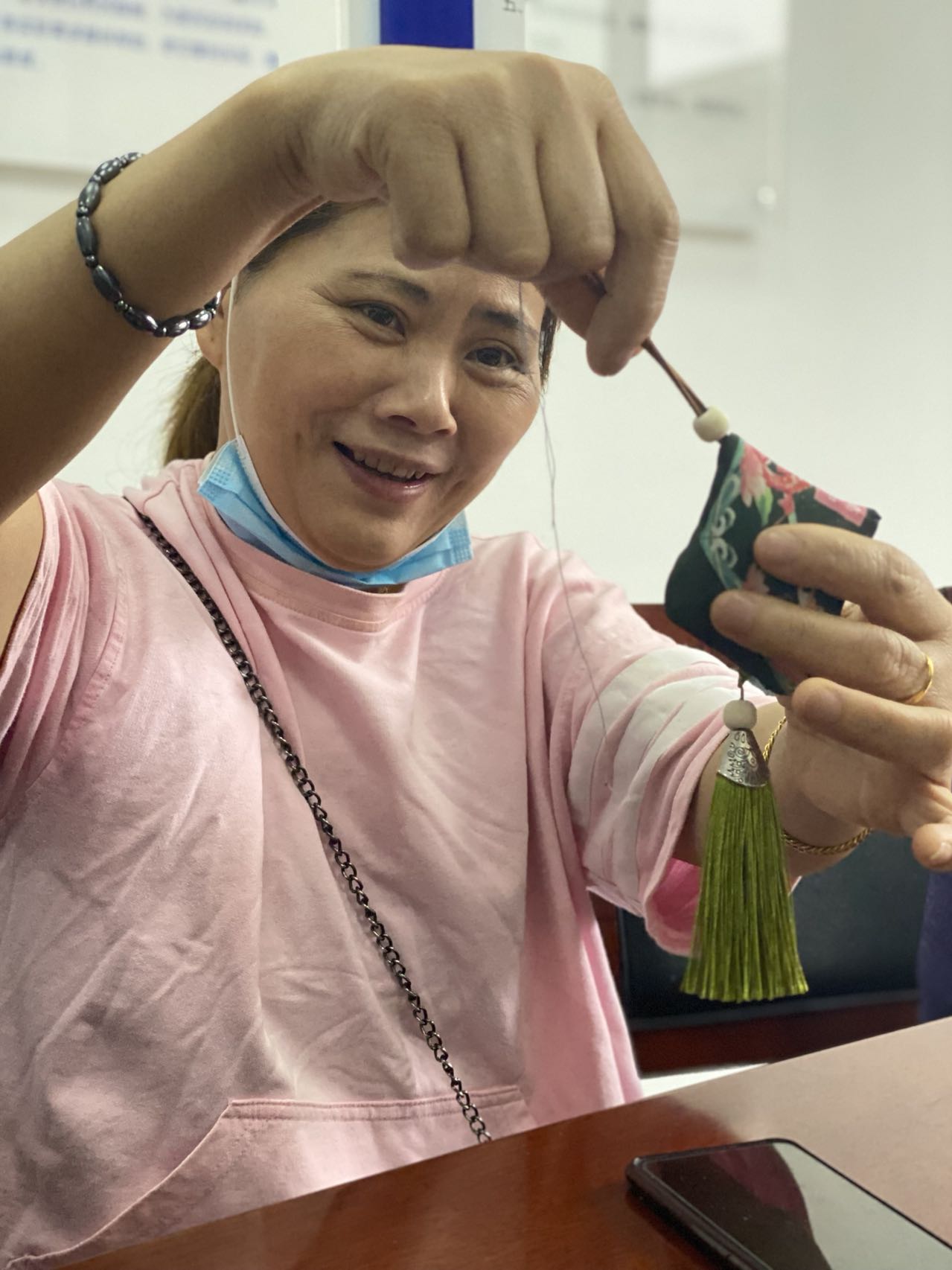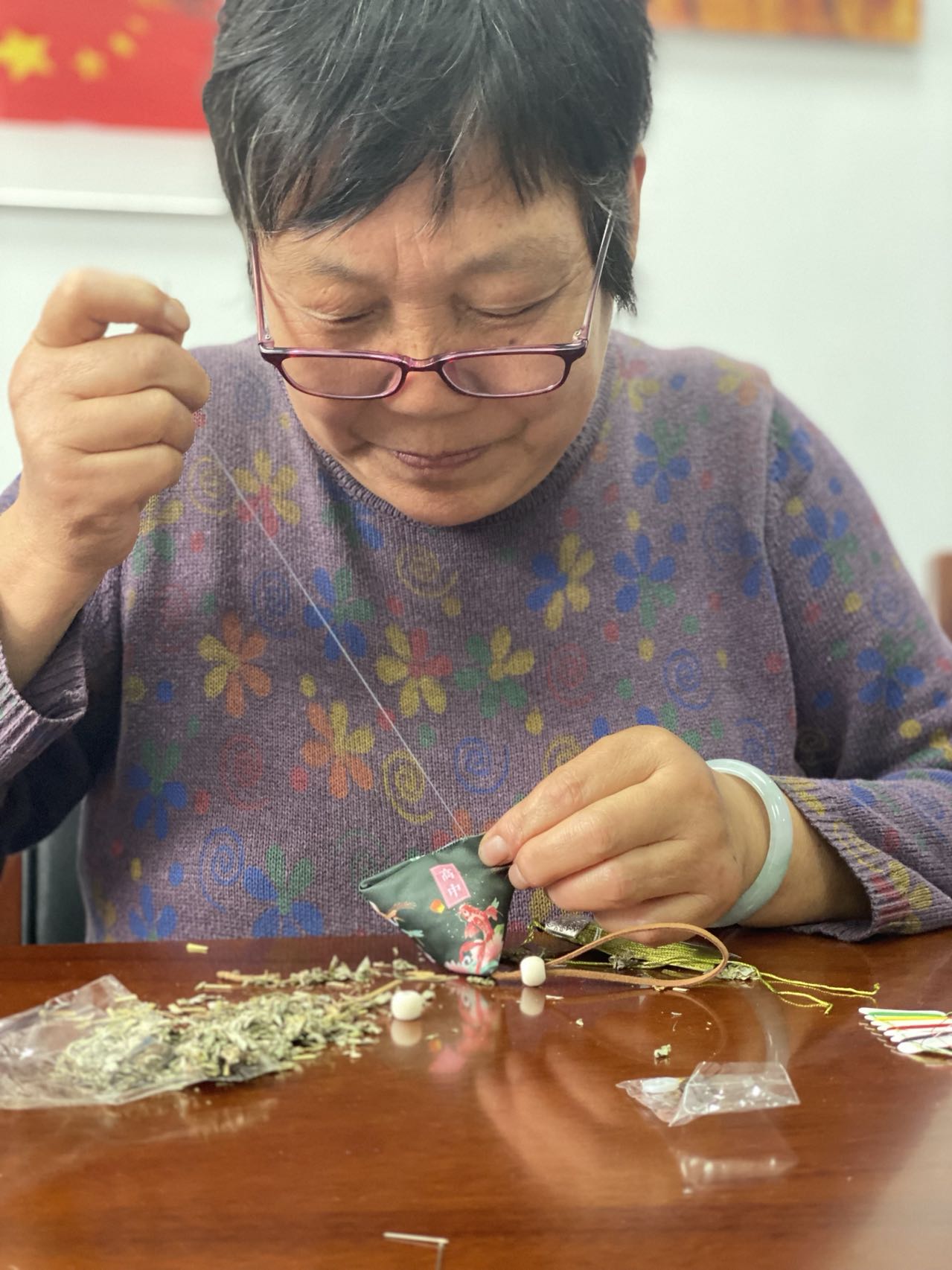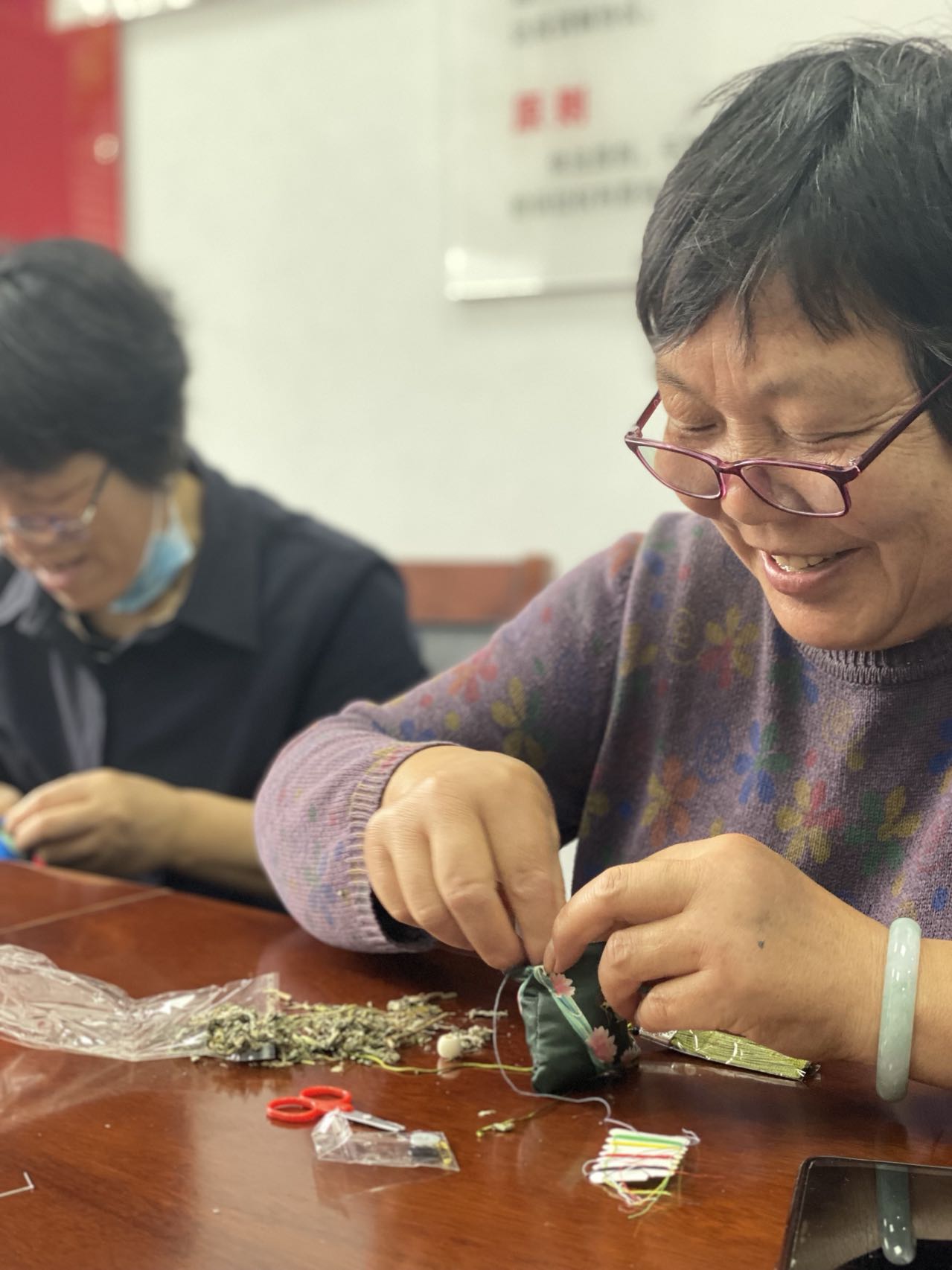 “这是我第一次做香袋,我跟大家不一样,我做的是四方的,你们做的三角香袋。”俞阿姨高兴地说。