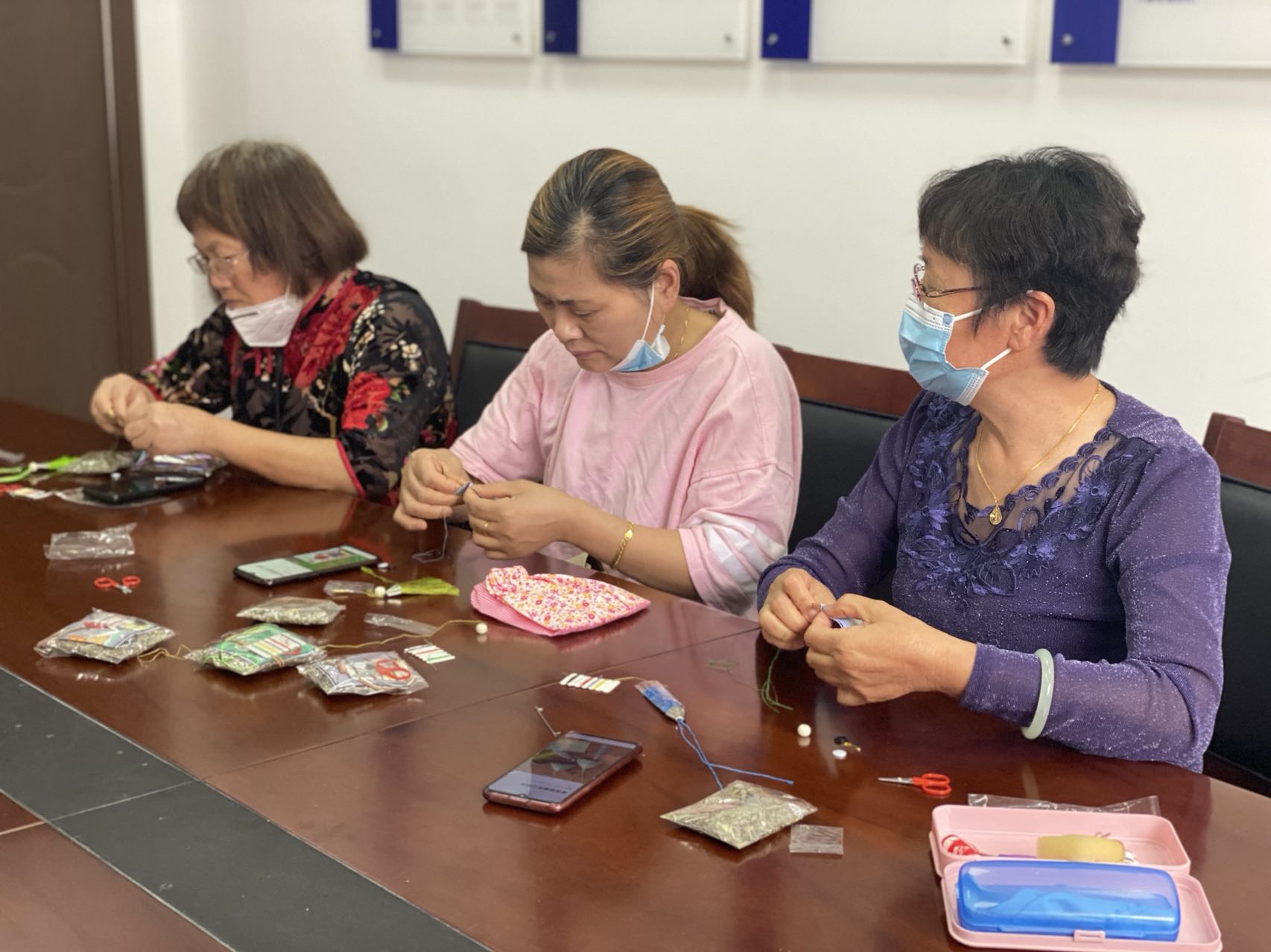 村妇联邀请巾帼志愿者开展创意DIY制作端午防疫香袋活动,桌上摆满了五颜六色的彩绳、丝线、挂件配齐、香料等。大家一边看视频一边研究。一钩、一锁,细针轻舞,织出美丽香袋,一折、一缠,巧手穿梭,编出五彩香囊。你一言我一语,互相帮助,一边做香袋一边聊天,欢声笑语不断。