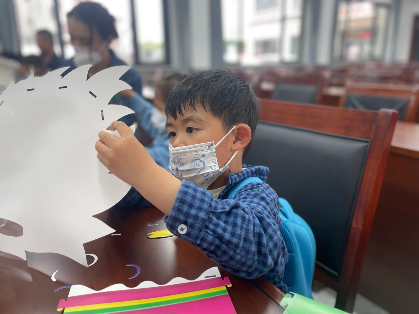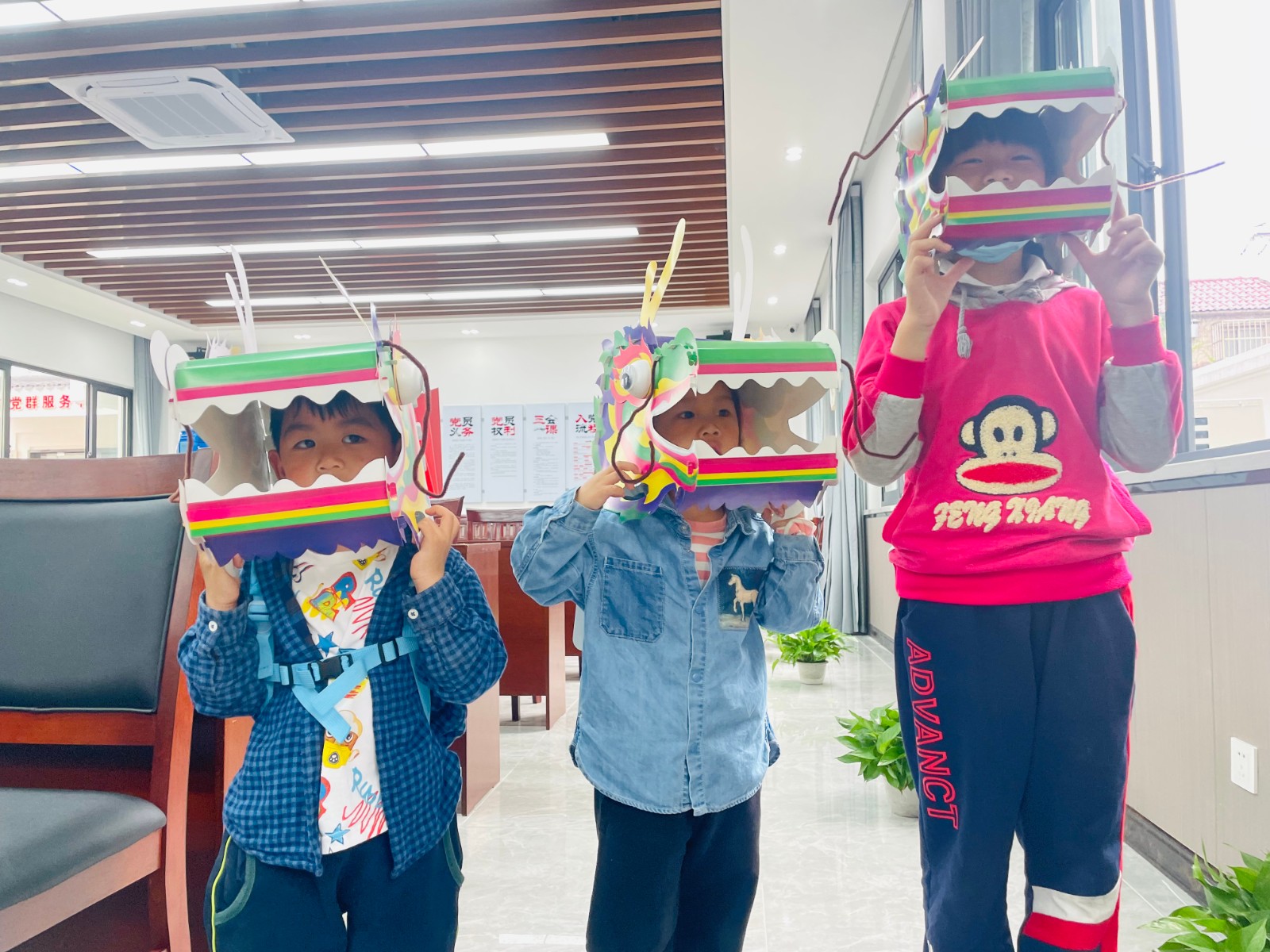端午文化知识科普过后,村工作人员将舞龙手工头套制作材料分发给孩子们,在耐心讲解完龙套制作的具体步骤后,有的孩子们自己独立制作,有的需要和大人一起制作。不一会儿,一个个五彩斑斓的舞龙头套就在孩子们的巧手下纷纷呈现在眼前,孩子们互相欣赏着各自手上的作品,纷纷戴在头上,体验一把,获得了满满成就感的同时,本次活动也切身让孩子们感受到了中华传统文化的独特魅力。