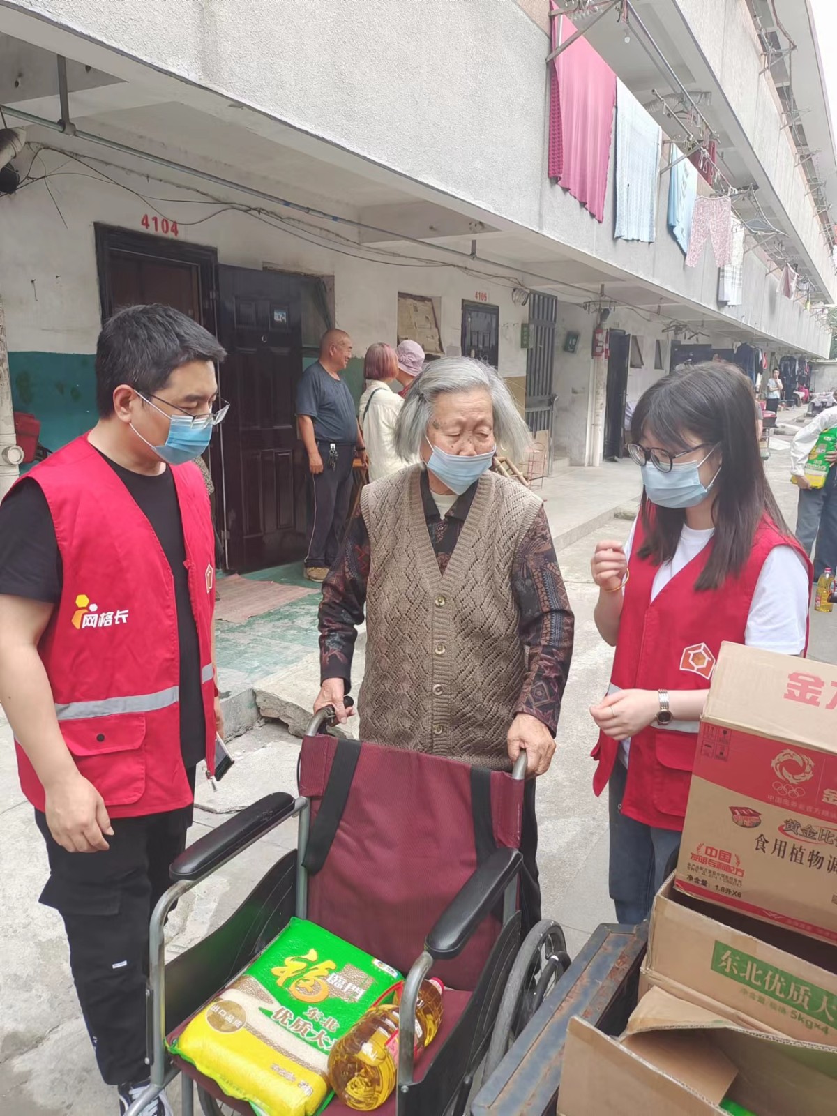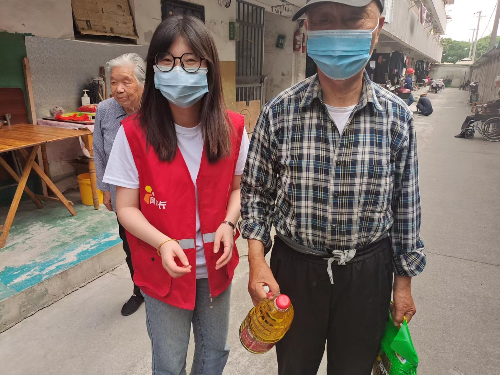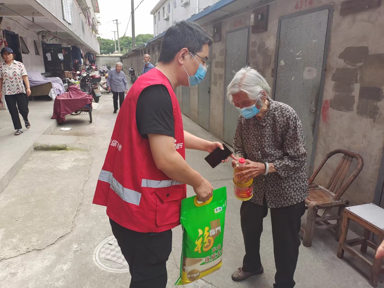 527下午,网格员和志愿者走访了居住在沈家安置房的六名独居高龄老人,他们都是近期从拆迁自然村搬入的,由于他们中不少人腿脚不便,对新的居住环境也不熟悉,因此平时很少出门采购物品。网格员和志愿者为老人送来了他们日常急需的大米和食用油,老人们十分高兴。八十岁的王海凡老人说,现在外面有疫情,自己挺害怕的,平时也不怎么出门,孩子又不在身边,采购成了麻烦事。多亏你们送来的米和油,解了燃眉之急。