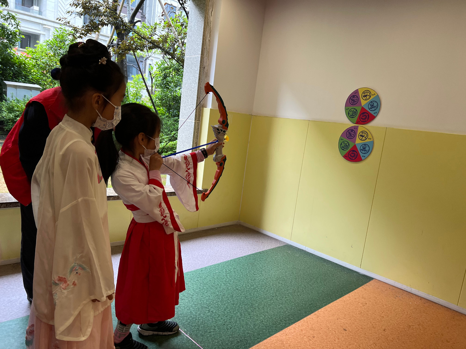 早上,万象社区的架空层里便早早地拉起了横幅,摆放整齐的桌子上放置着各类游戏道具和手工材料包,有龙舟、五彩绳、弓箭、香囊……9点不到,身着汉服亲子们陆续到达活动现场,大家东看看,西瞅瞅,对活动场上的道具都十分好奇,家长和孩子们都忍不住提前试玩了起来。