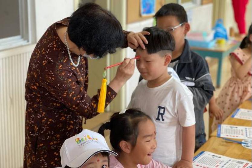 活动中,志愿者将编制五彩绳的材料分发给孩子们,和孩子们一起编织五彩绳,并将编好的五彩绳寄在孩子们的手腕上,随后,志愿者们在每名小朋友额头点雄黄,寓意驱除病邪、吉祥平安。