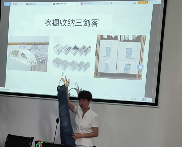 培训现场,北仑青鸟整理信息咨询服务公司规划整理收纳师蔡依芬根据自己专业整理收纳的经验,从整理收纳的起源讲起,到科学收纳的方法,重点讲解了按照衣橱空间认知、衣物及收纳工具分类、黄金区域收纳法则三大部分;并强调断舍离的理念。“会收拾不等于会整理,整理也不是码整齐,而是找到自己的生活方式。”蔡依芬引导大家学会做生活的减法,减去多余的物品。通过不断的筛选整理物品,了解自己,让生活与学习井井有条。“这是一个让人舒服的行为,也是让人开心的方法。”