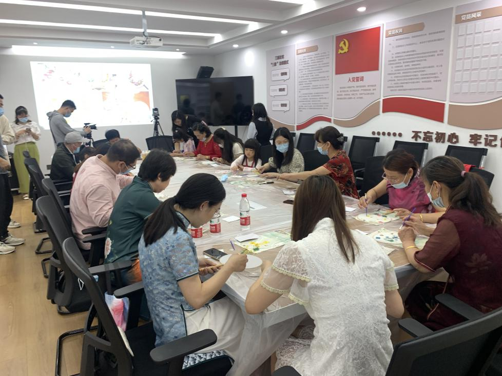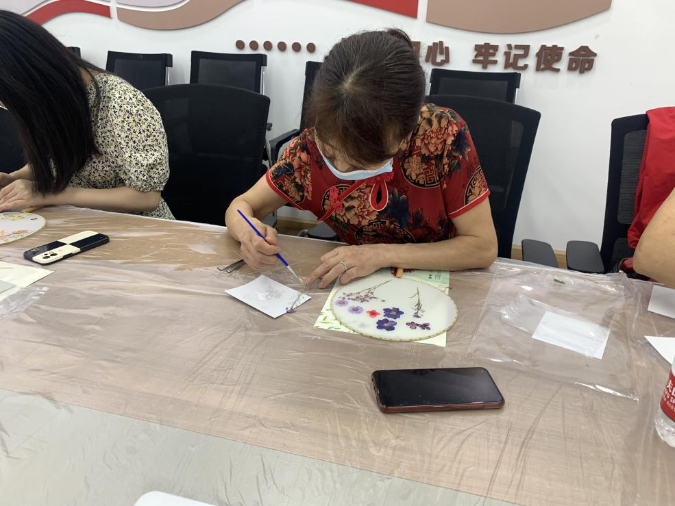纤纤玉手执扇轻摇,一颦一笑翩若惊鸿。团扇起源于中国,是中国汉族传统工艺品及艺术品,代表着团圆友善、吉祥如意。为弘扬中华民族的优秀传统文化,进一步丰富居民的文化生活, 2022年6月11日,兰庭社区开展压花团扇制作。活动现场,老师首先对团扇的发展历史和艺术特色进行了简要介绍,并结合PPT演示讲解了扇面材质、图案特点等相关知识,示范了团扇的压花粘贴步骤方法。在老师的悉心指导下,居民们开始学习构图及粘贴等团扇绘制的基本技巧。大家在享受自己动手画团扇的乐趣的同时也互相进行帮助,不一会儿,一把把形态各异的团扇顿时变得古色古香,富有韵味。也正是这样一场趣味横生的活动,提前为辖区居民送上了阵阵清凉。
