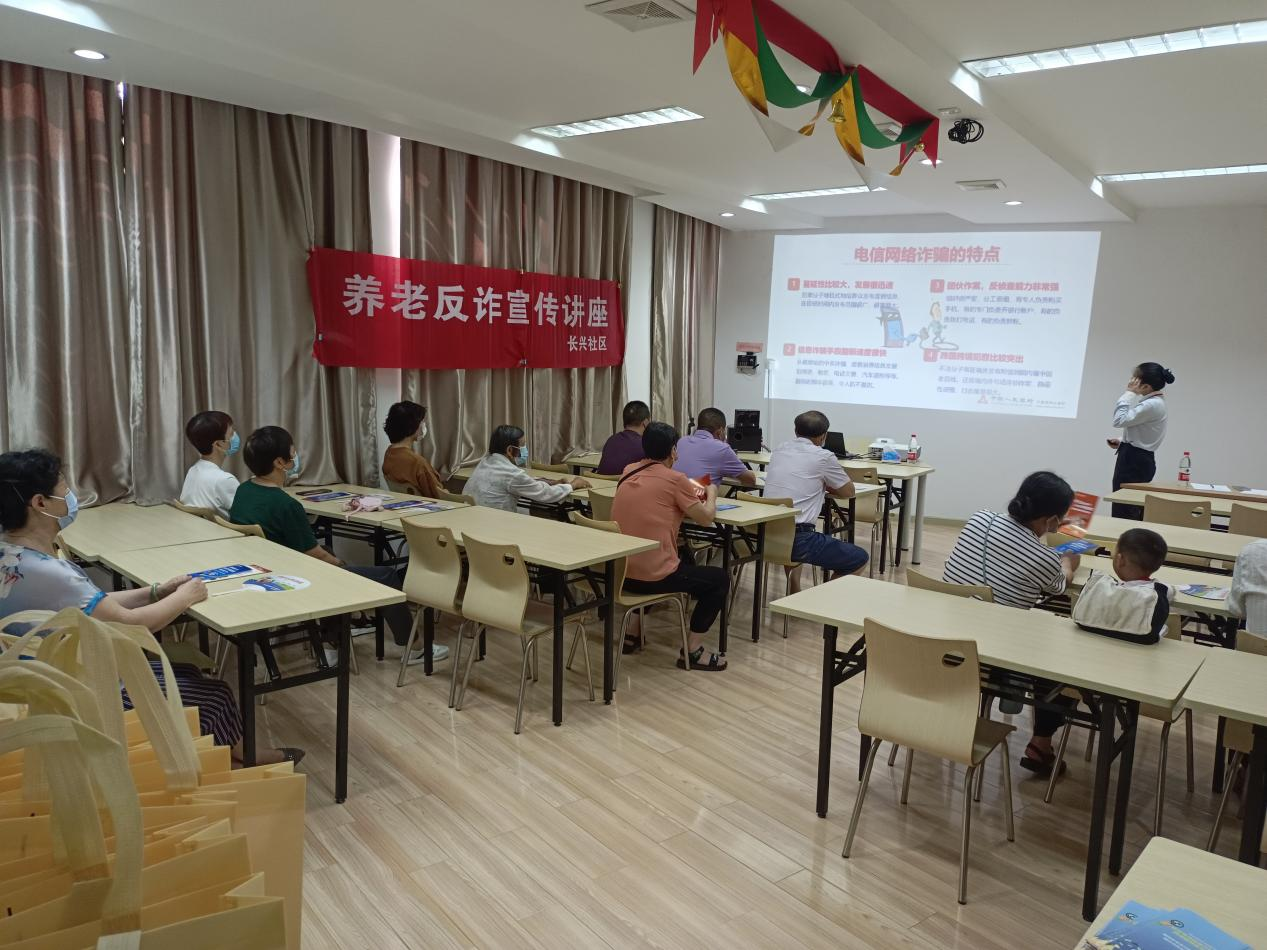 为进一步提高辖区老年人反诈意识,确保财产不损失少损失,守护社区安定团结,前江街道长兴社区网格长想方设法开展各类“反诈”宣传活动。近日,社区网格长邀请宁波银行江北支行开展了《“反诈”进社区,捂紧养老钱》养老反诈宣传讲座活动。