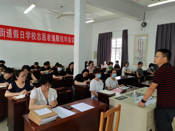 会议首先由大碶成校王校长对与会人员讲解了假日学校的重要性和今年的要求,要将安全工作放在首位,要进一步提高办学质量,树立创新意识,并在多年办学经验的基础上做出更科学更合理的安排,业务上各社区要结合自身特色开展教学活动,重点做好、做强品牌特色。其二做好台帐资料等。接下来结对活动正式开始,傅春燕老师对做好假日学校与教师结对衔接工作的具体事项作了说明。随后由街道关工委负责人就业务方面进行具体布置和安排。