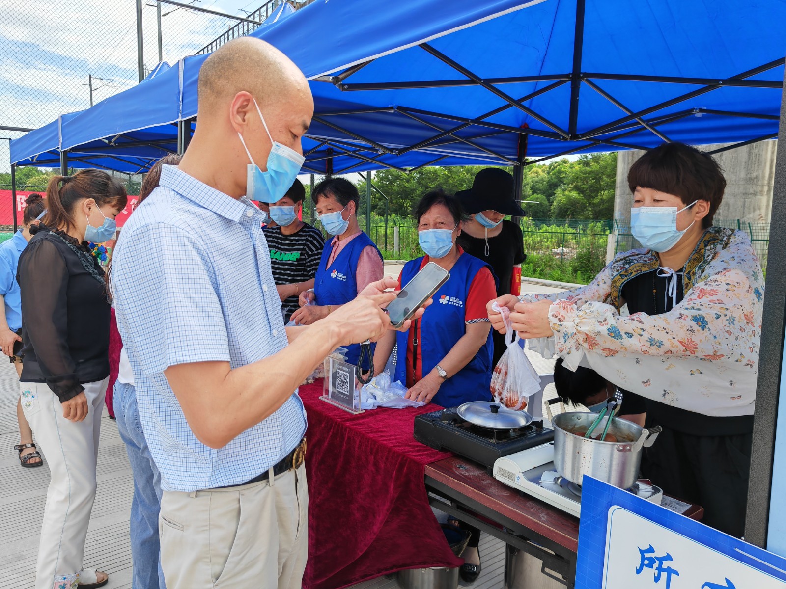 活动现场,人声鼎沸,吸引了大量的居民和企业职工前来参与。香喷喷的茶叶蛋、鲜美的小馄饨、清凉的木莲冻还有极富本特色的灰汁团,在巧阿姨美食社的摊位前,围满了前来购买的居民。“在老远就闻到香味了,加上早上出门急还没吃早饭,我就赶紧过来了,阿姨们的厨艺太好了,好吃。”正吃着馄饨排队买灰汁团的杨先生说。