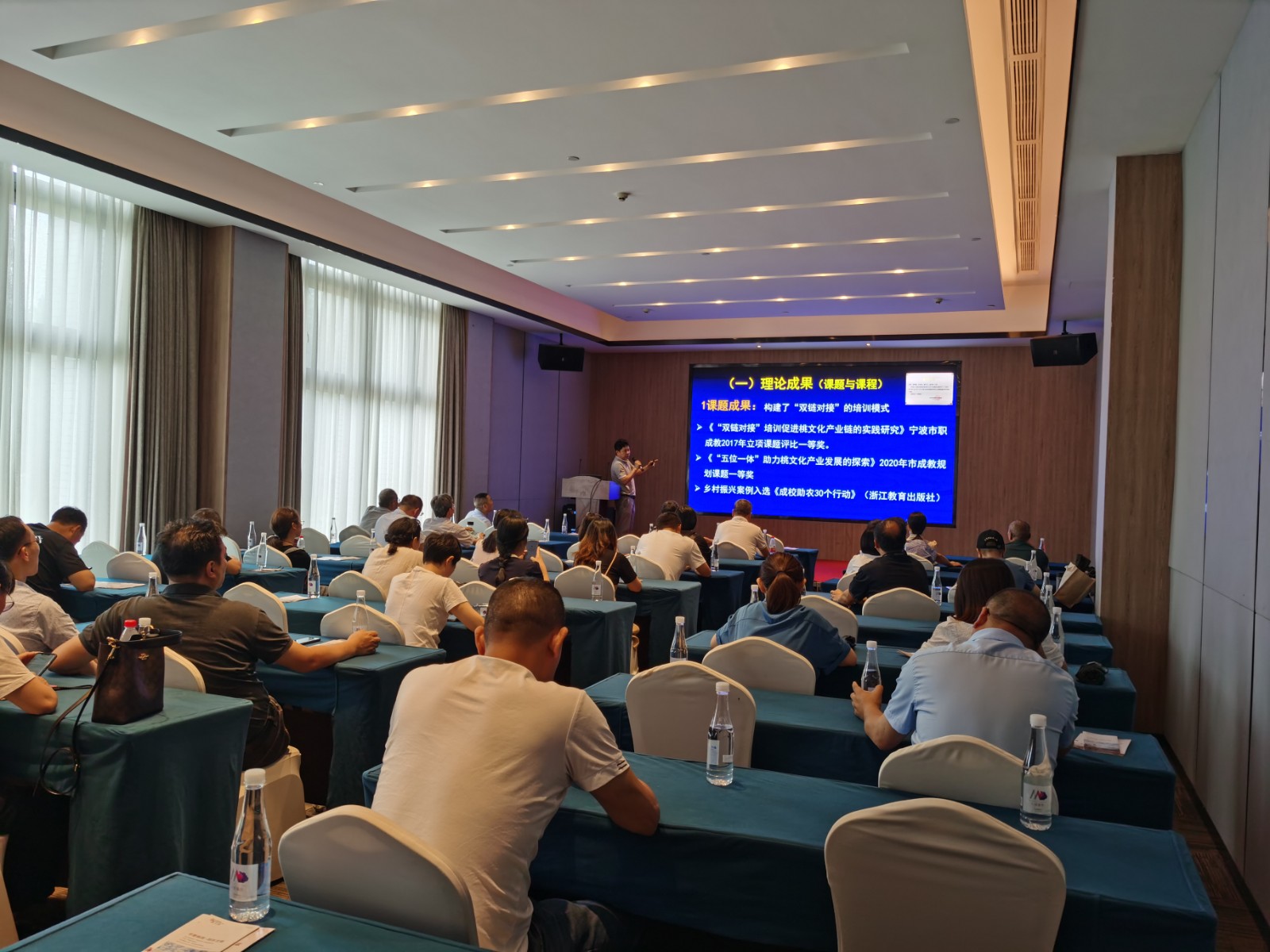 接着,大家聆听了奉化职成教教研室竺辉老师的“双链对接、五学并进拉长桃文化产业链的实践”的报告。竺老师指出,务农重本,国之大纲;乡村振兴,人才为基。加快特色农业发展,形成“一镇一特、一村一品”,关键在于培育一支留得安心、能够创新、懂得技术的新型职业农民,这是乡村振兴战略赋予农村成人学校的时代要求。萧王庙成校以“培训智慧农民、助力产业发展”为理念,借势“天下第一桃园”水蜜桃品牌和桃链文化产业振兴要求,顺着“产业链→课程链→培训链→资源链”的路径,依次推开教育培训活动,培育了大量桃文化产业链上的各类能人,拉长和振兴了桃文化产业链,构建的“产教融合、双链对接”服务模式,为农村成校服务乡村振兴提供了可借鉴的样本。