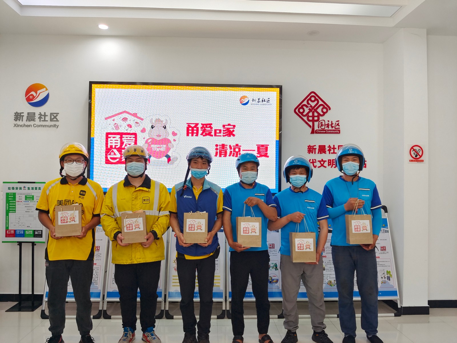 “最近太热了,你们快来社区坐一下”627日上午新晨社区甬爱e家迎来了一批快递小哥。近日气温升高,作为穿梭在这个城市大街小巷的“摆渡人”,外卖小哥用自己的脚步为大家的生活带来了极大的便利。为了关爱这一特殊群体,回馈他们的付出,新晨社区甬爱e家特意为他们准备了清凉包,希望他们在为其他人服务的同时,也能保护好自己,在炎炎夏日能感受到一丝清凉。