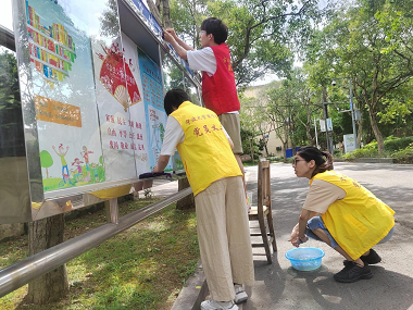 烈日下党员志愿者身穿志愿者服装,拿着抹布、水盆、钳子、垃圾袋等工具,充分发挥“不怕脏、不怕累”的实干精神,对辖区内卫生死角、宣传栏、绿化带等地进行彻底清理。学党史、办实事,在每个党员心中扎根,志愿者们冲锋在前,用自己的汗水浇灌自己的家园。