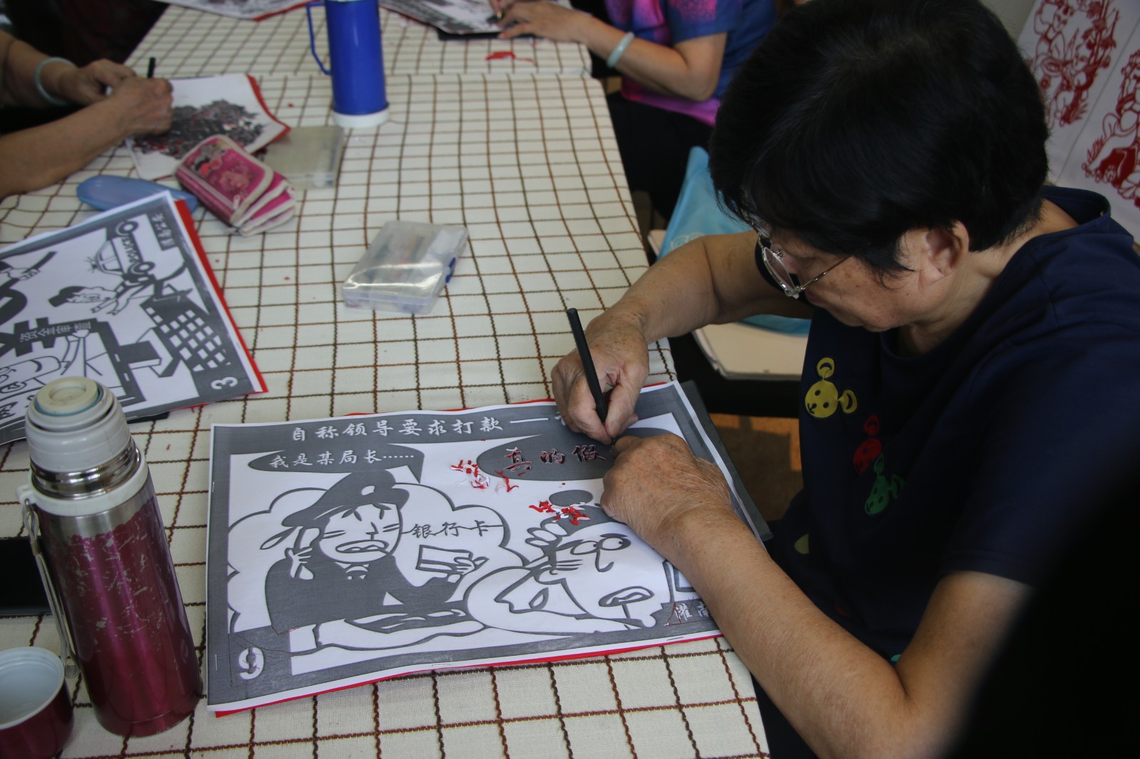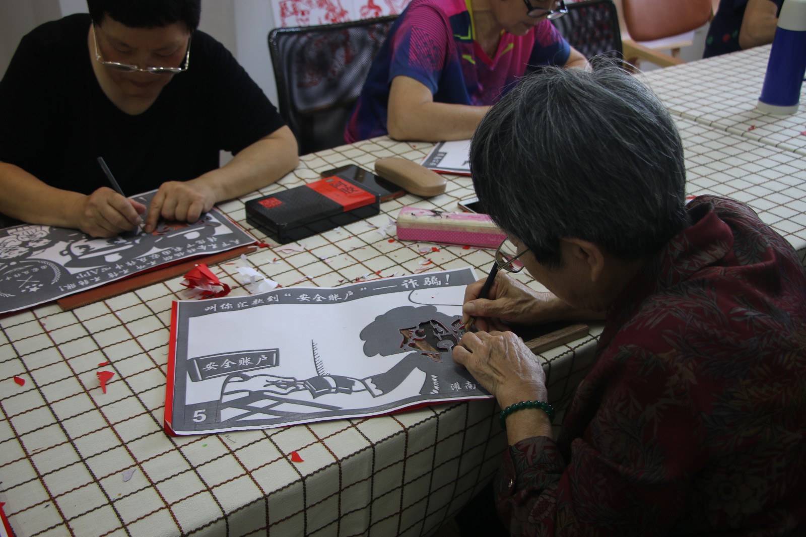 在工作室的桌面上,一幅幅剪纸图案摆放在阿姨们的面前,大家仔细端详,细细思量,探讨着剪纸所需要的技巧和顺序步骤。随后大家将写有各种反诈宣传标语的图片沿着文字和图案的纹路小心翼翼地剪裁起来“这些细小的部位在裁剪的时候要特别小心,下刀要稳一点,不然整个作品就损坏了。”剪纸吧成员洪茜阿姨说。剪刀游走、刻刀翻飞在阿姨们的手中刻刀和剪刀仿佛都有了生命,没多久,一张张剪纸画惟妙惟肖地展现在了大家的眼前