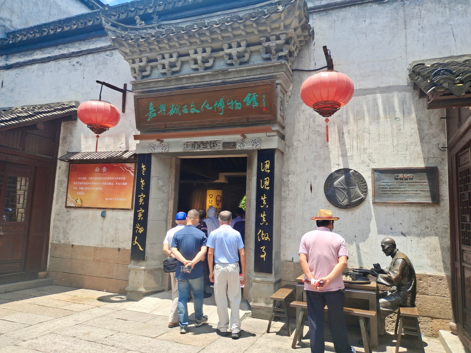 村党员们来到嘉兴粽子文化博物馆,它是一个以反映嘉兴粽子历史与粽子文化的专题性博物馆,也是我国目前唯一一家嘉兴粽子文化主题博物馆。大家在馆内看到了许多粽子的相关历史资料和文物,通过提示牌上的注解,了解嘉兴粽子文化的起源及传承脉络。馆内还陈列了很多旧时代的农作工具,大家对此都很有兴趣。来到粽子的摇篮-张家弄,1921年,中共一大代表下榻之地-鸳湖旅社便坐落于此。据说一大代表们抵达后以街边的几只粽子裹腹,品尝后赞不绝口。