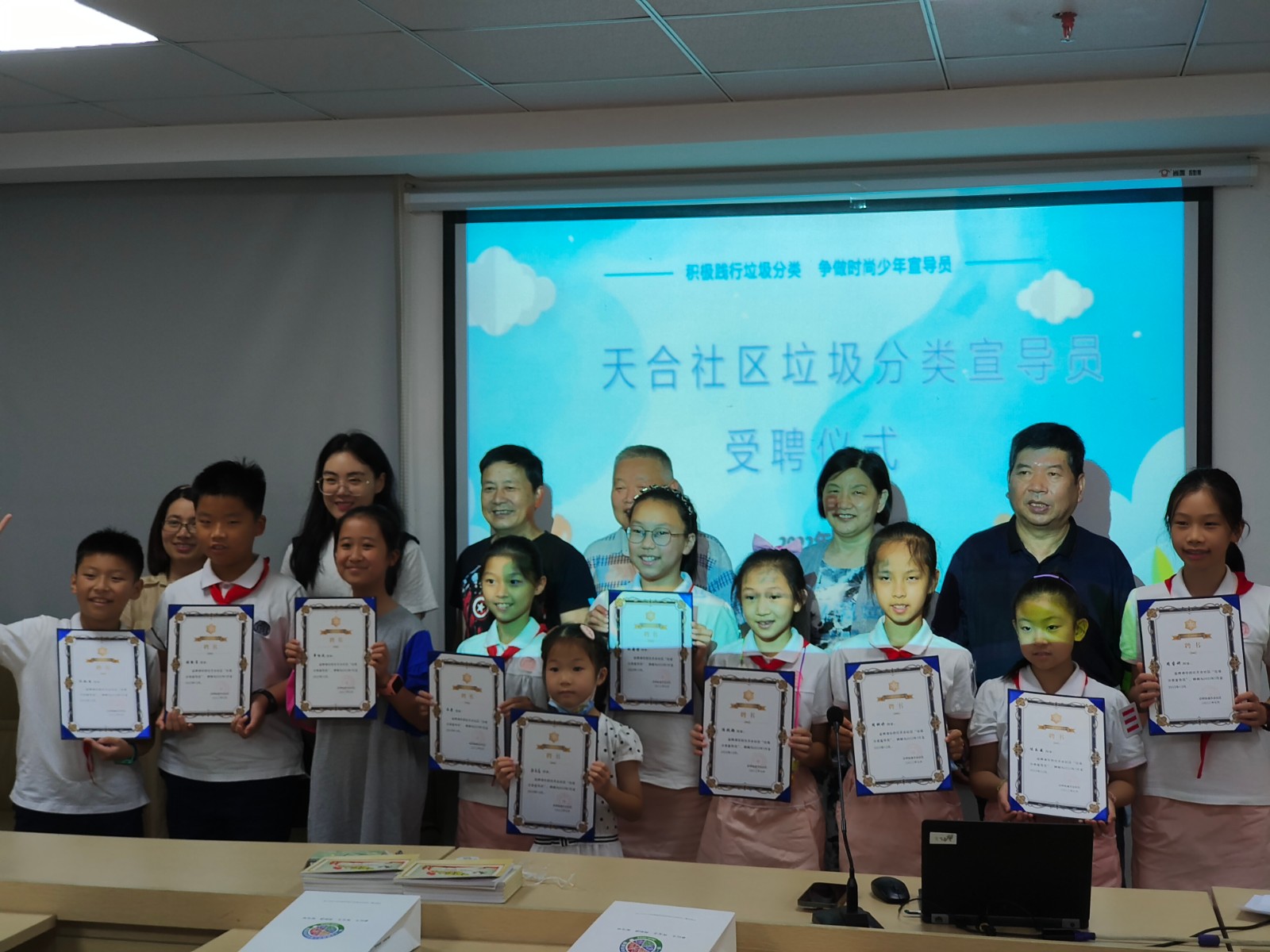 今天,在天合社区的假日学校实践活动教室里充满孩子们的欢声笑语,这里正在开展一场气象防灾减灾知识小课堂,同时也举行水尚阑珊小区垃圾分类13名“小小宣讲员”受聘仪式。来自宁波气象局天气预报节目主持人的鲍老师和宁波市气象局科普讲师团成员认真讲解了气象灾害的种类和应对方法,江北区防灾减灾科成科长也特别针对前段时间宁波市出现冰雹天气进行科普和问答互动,提高孩子们应对突发事件的能力和安全意识,同时呼吁孩子及家长要绿色环保,低碳生活。课堂上老师和学生之间频频互动,大家积极性很高,纷纷举手发言,表达自己的想法,提出自己的疑问。今天的活动还邀请了13位来自水尚阑珊惠贞书院的学生代表作为小区的垃圾分类宣导团队,接下“垃圾分类,行动有我”的分类任务,更有小区“五老”代表、优秀党员、青年干部、网格员代表为学生发放聘书,并通过传帮带的方式在辖区践行党建引领,垃圾分类的行动。张同学代表说:“这堂课让我对气象领域有了新的认识,接过的这份聘书让我们对分类的领域多了份责任,我们将以身作则,担负起宣讲员的使命,带动身边的人努力争做文明宁波人”。