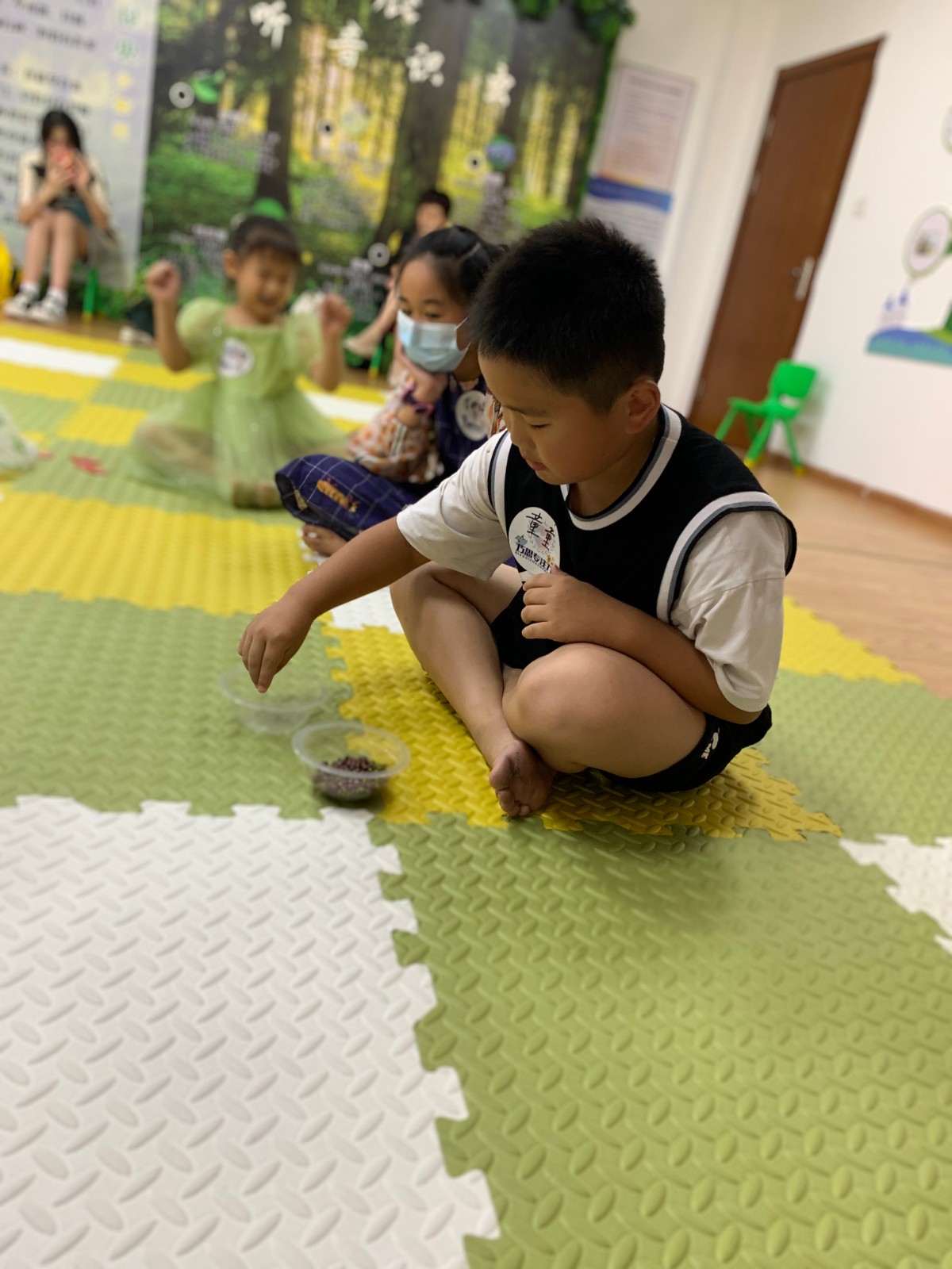 接着橘子老师通过专业的游戏包括挑拣红豆和绿豆、舒尔特方格来锻炼小朋友的专注力。分组比赛的形式让大家都很认真地投入到游戏中来,为了团队的成绩集中精神,同时也在一旁为正在比赛的队友加油鼓劲。