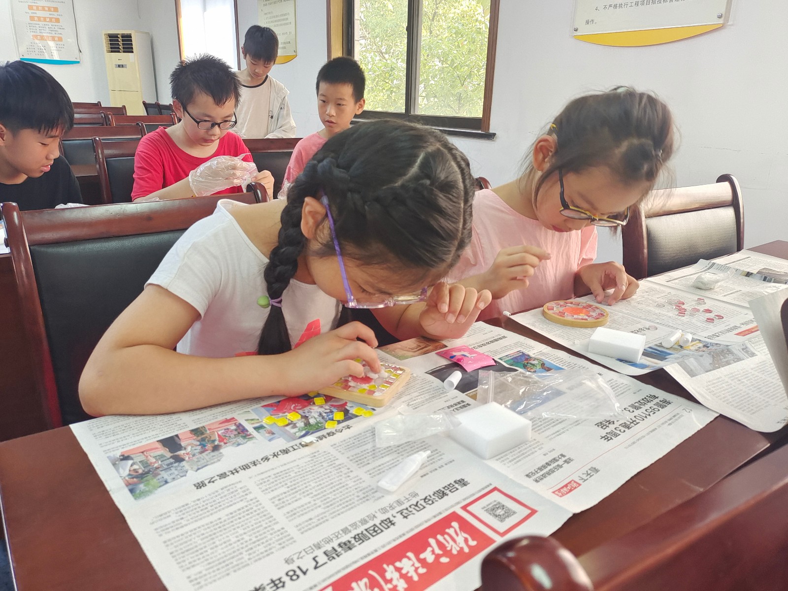 活动开始,网格长为每位小朋友发放爱国马赛克杯垫的材料包,随后向小朋友详细介绍了马赛克工艺的历史、种类以及爱国杯垫的制作方法和注意事项,小朋友们一边认真聆听讲解,一边迫不及待的拿起材料开始制作。