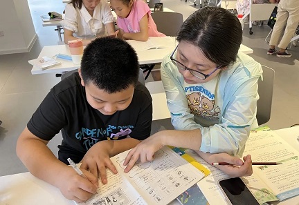 夏日炎炎,但孩子们都能准时到达场地,和老师们一起将课桌椅排好,并按位置就坐。拿出书本,定下目标,孩子们快速地进入了学习状态,小老师们也就此展开“点对点”教学,针对问题答疑解惑。