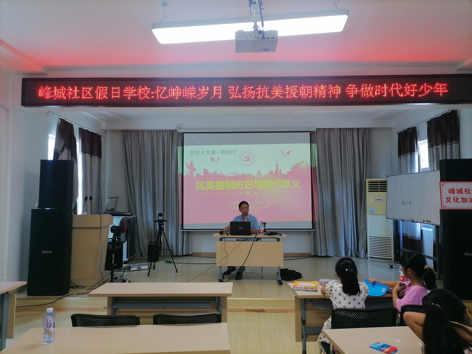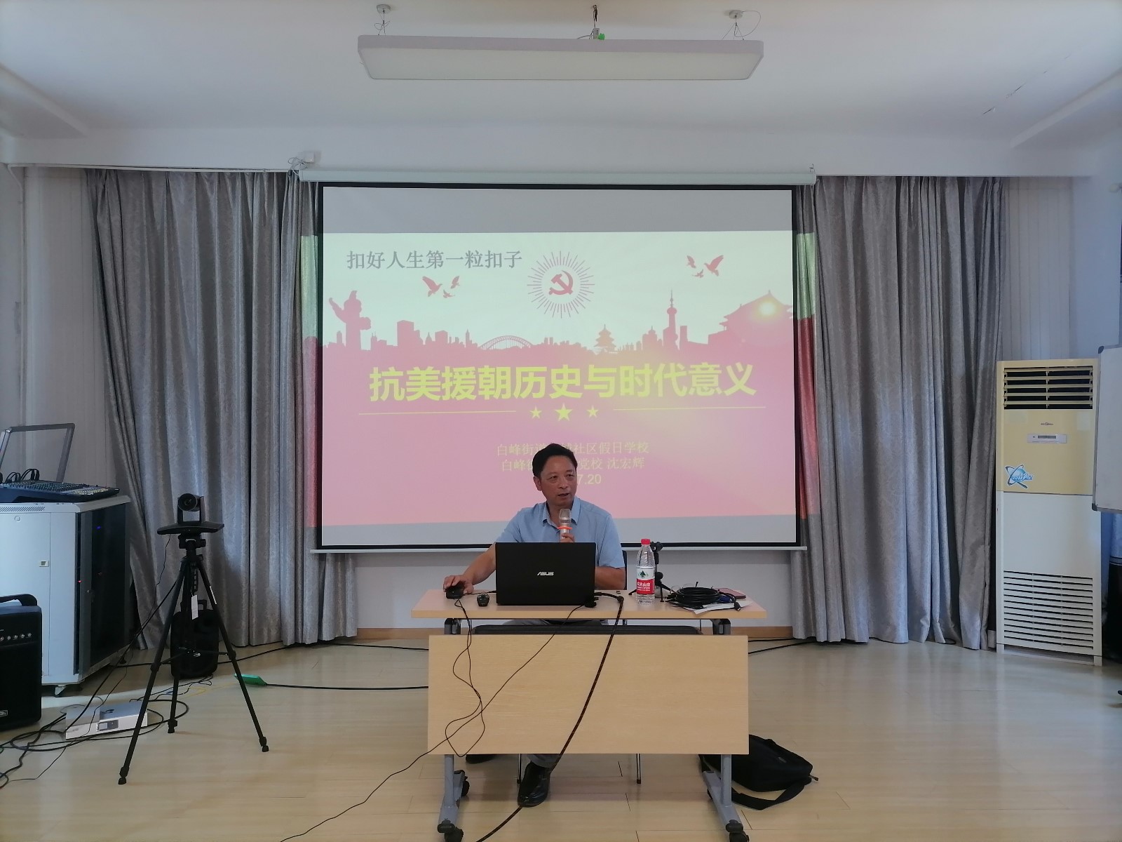 为纪念中国人民志愿军抗美援朝出国作战72周年,抒写和铭记抗美援朝精神,传播志愿军英烈事迹,弘扬爱国主义精神,扣好青少年人生第一粒扣子,7月20日上午,峰城社区党群服务中心邀请白峰街道工委党校副校长沈宏辉开展一堂主题为《抗美援朝历史与时代意义》爱国历史教育课。