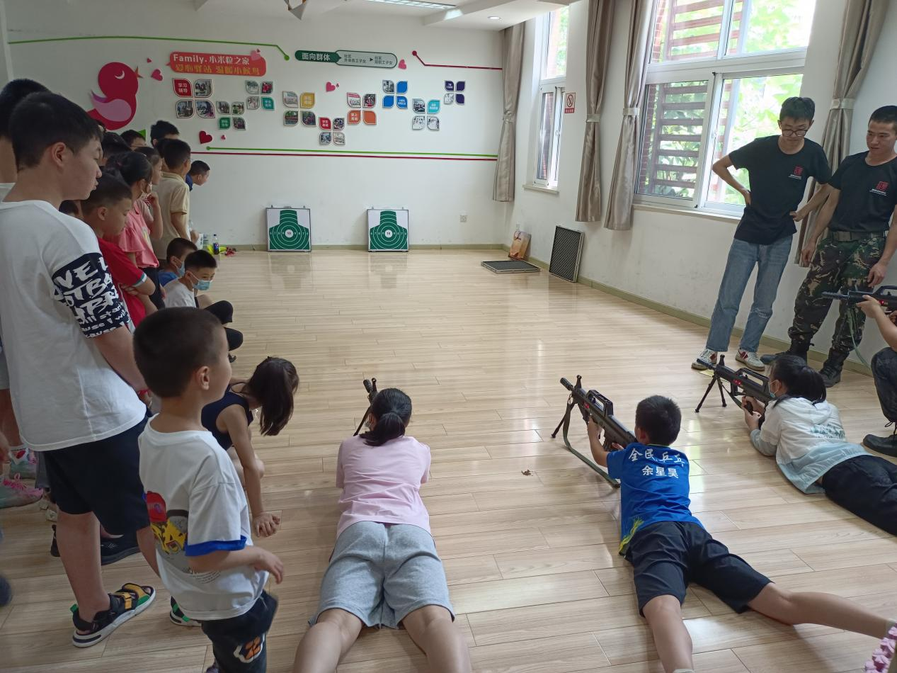军训最重要的就是站军姿和排队列,孩子们都积极配合教官的口令:“立正!稍息!向右看齐!”孩子们立马进入小军人的氛围中,精气神都非常好。之后教官带领孩子们动手尝试和学习叠军被,叠衣服等活动,这些军人们最习以为常的事,也是一个提高自律意识的小习惯。后面教官给孩子们科普了枪的类型和历史,并进行了练习模拟枪的活动。最后进行传炸药包的小游戏,孩子们玩的都很开心。