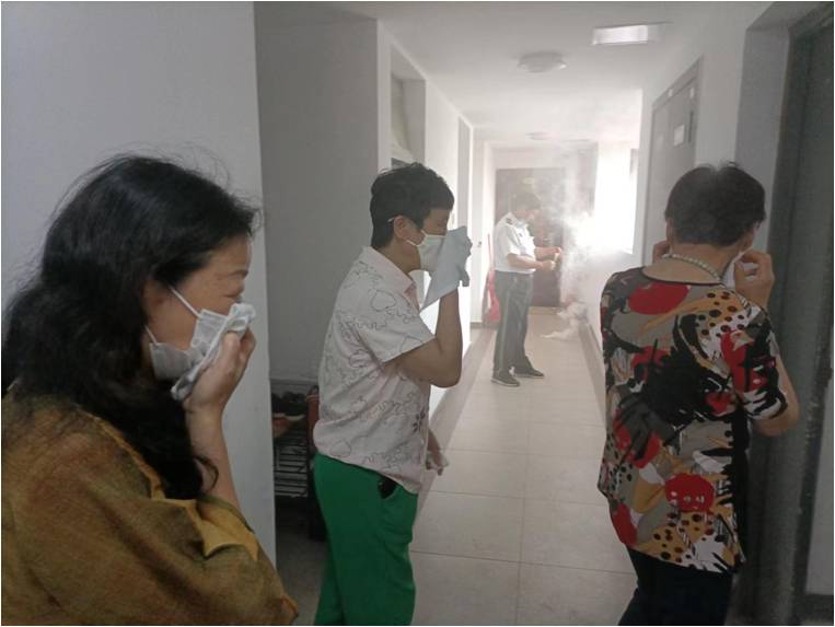本次演练首先是针对6幢15单元3楼着火点开展消防安全逃生演练,通过消防演练使每个居民熟悉消防应急预案的基本程序,在发生火灾后真正掌握报警、疏散、救援、安全警戒和防护、善后处理的基本内容和方法,并熟悉了解有关消防设备的主要用途、摆放位置及使用方法。参加演练的居民认真听取演练要点,捂住口鼻,有序从安全出口撤离。