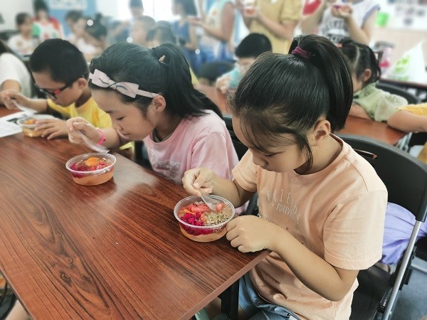 活动伊始,黄老师先向小朋友们普及了冰粉的由来和作用,随后开始介绍冰粉的制作。黄老师一边讲解,一边邀请小朋友参与冰粉的制作。搓冰粉、熬糖水、切水果、洒配料...每一个步骤小朋友都积极参与。在大家的共同努力下,一碗碗清凉可口的冰粉便排满了桌子,色彩艳丽,配料丰富,看着诱人的夏季消暑美食,小朋友们都迫不及待就吃起自己亲手做的美食,脸上洋溢着幸福的笑容。“我想把这碗冰粉带给我的妈妈和弟弟吃。”今年12岁的王语涵懂事地将冰粉打包。
