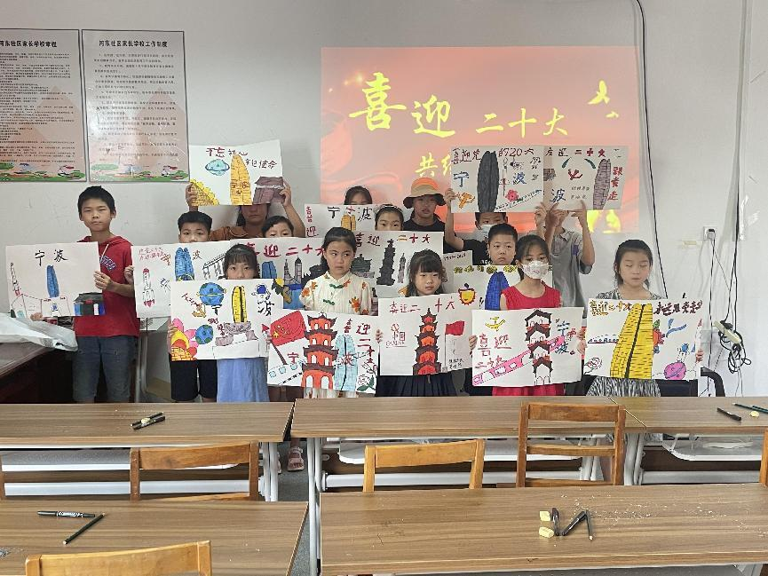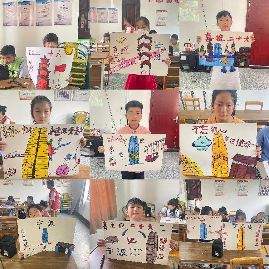 在活动中,志愿老师先给孩子们讲了二十大即将召开的背景,并引入话题将宁波各类景点的照片给孩子们做参考。随后孩子们用彩笔画下宁波的景色,有玉米楼、天一阁、鼓楼、河姆渡遗址等各种宁波的景点。除了画下这些景色外,孩子们还画了冬奥会冰墩墩的形象、高铁、国旗、党徽、火箭、宇航员等形状。并在画纸上写下“喜迎二十大”、“不忘初心、牢记使命”等字眼。画纸上的每一个形象都在表现着我们的国家现在在不断发展,同时代表着孩子们也能积极了解这类知识,并将这类知识深刻印在自己的心中。