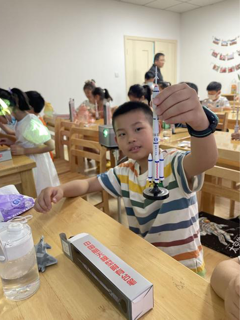 老师在下半节课在中国航天事业上给小朋友们进行了科普,带领小朋友们开展了拼搭航天火箭的活动。通过寓教于乐的动手实践教学方法,让小朋友们不仅深入了解了航天火箭的构造,同时还考验了小朋友们的动手能力。课程结束后小朋友们都依依不舍,快乐的氛围充斥着教室。