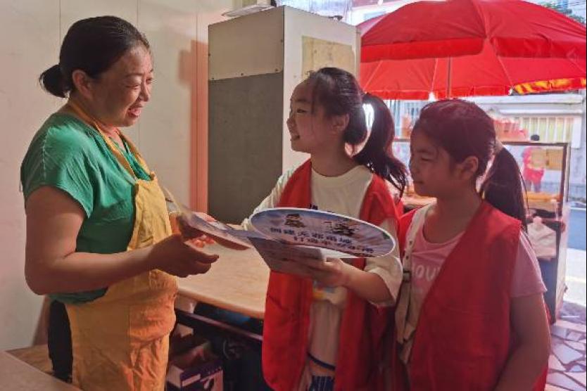 活动期间,穿着红色马甲的小志愿者们,穿梭在下邵社区的街头巷尾,分发着手中的宣传资料。“叔叔,这是《中华人民共和国反有组织犯罪法》宣传册,您了解一下,里面有扫恶除恶等相关内容。”李子阳小朋友对着路人讲解着宣传册上的内容,用孩子的话教大人如何安全自救,让这场志愿服务活动变得趣味十足。“这么热的天,这群小朋友积极分发宣传册,讲解上面的内容,太不容易了,我不能让这份辛苦白费了,回家一定好好学习这些内容。”一位收到宣传册的路人说。