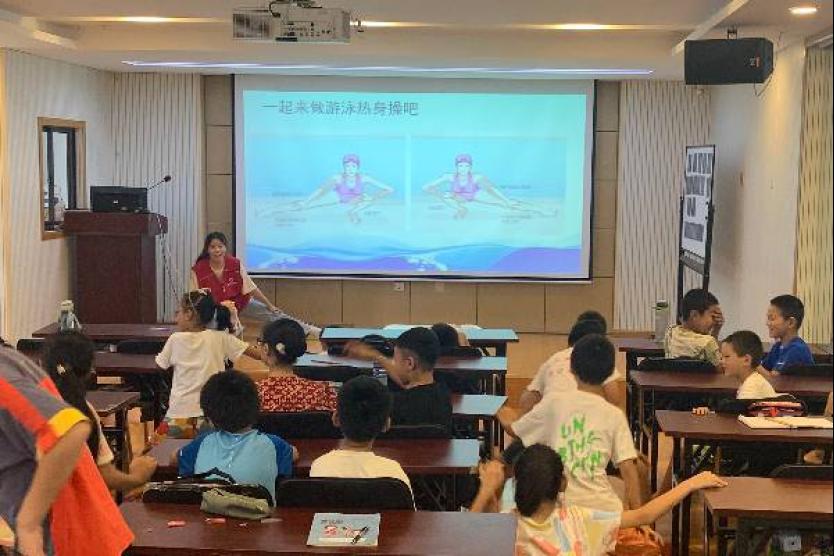 最后,授课老师告知小朋友,在游泳前切记不能盲目下水,一定要做好充分的准备运动。随后,在老师的带领下,小朋友们一起练习了游泳前的热身准备运动,给暑假安全再添一份保障。